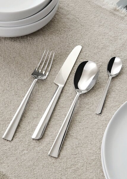 Bestickset bestående av sex bordsskedar, sex bordsgafflar, sex bordsknivar och sex kaffeskedar i spegelpolerat rostfritt stål 18/10.