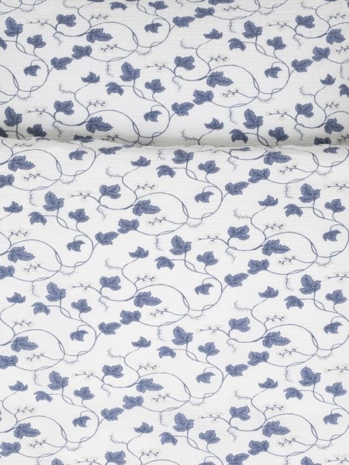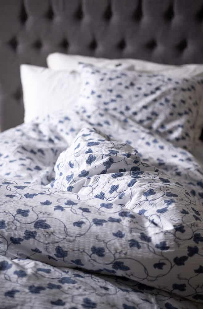 Krispigt bäddset i bäckebölja. Småmönstrat med slingrande rankor, blad och blommor i sommarblått mot vit botten.