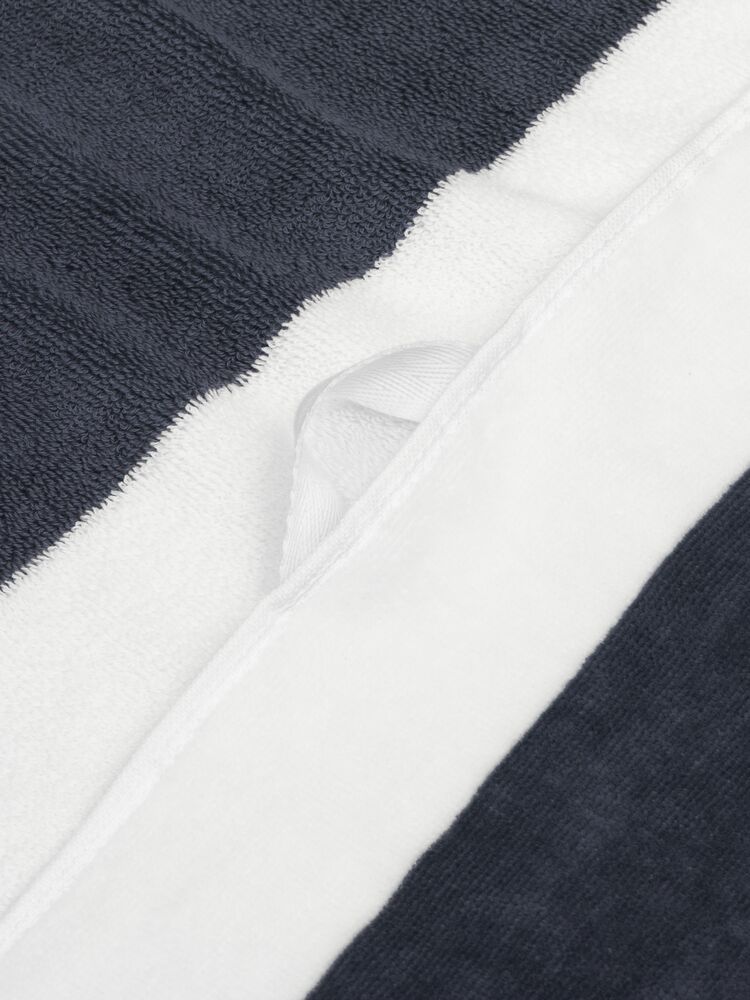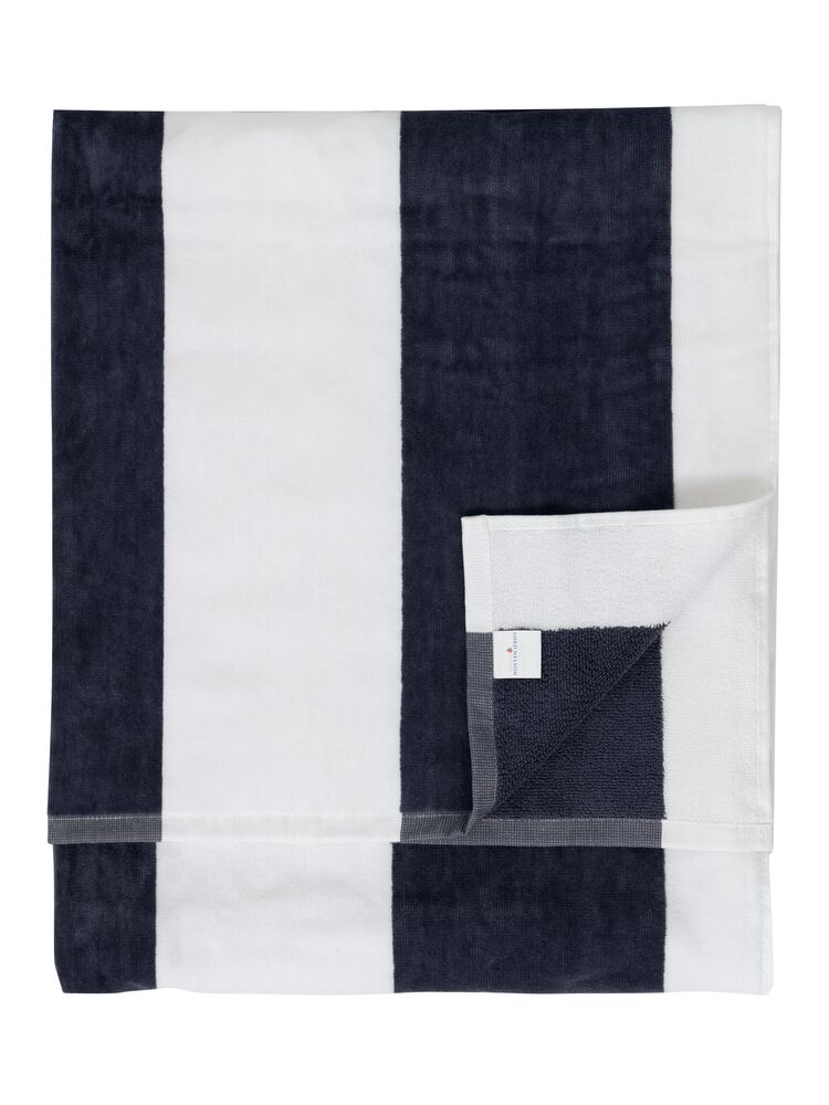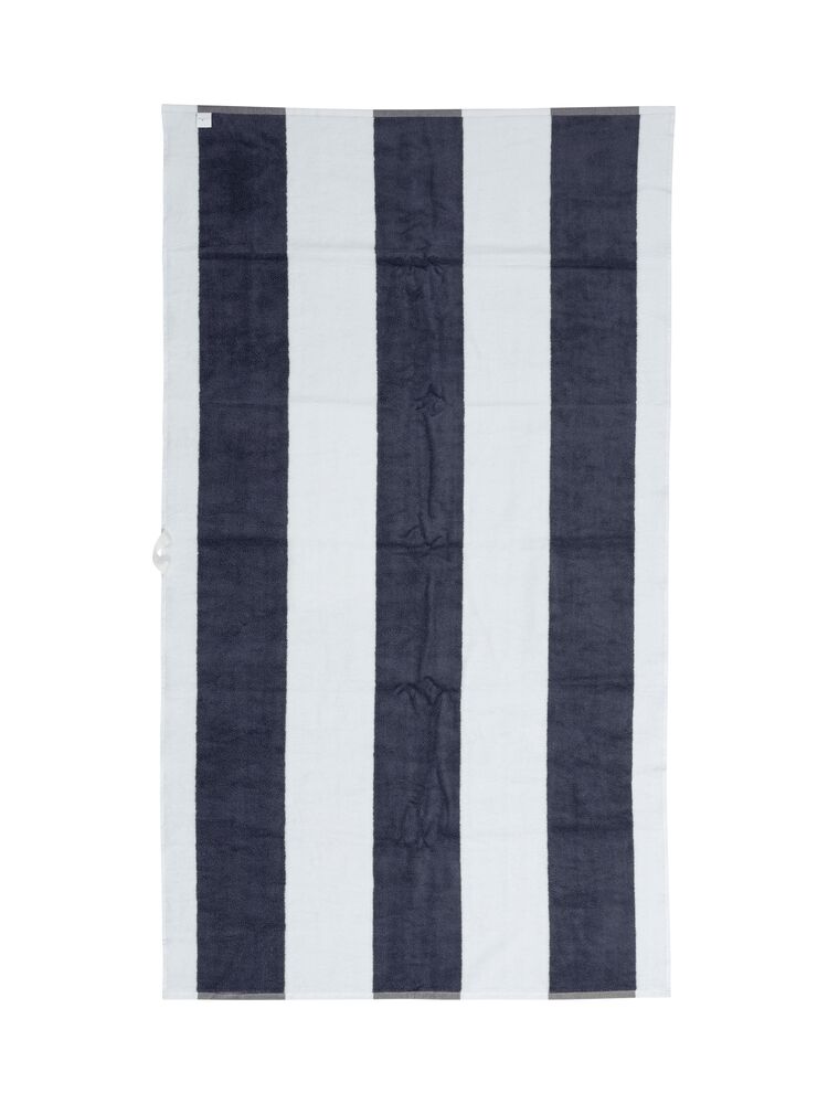 En klassisk strandhandduk i kraftig bomullsfrotté som tål sommarens alla äventyr. De breda ränderna ger en tidlös marin känsla och den generösa storleken gör den lika skön att ligga på som att svepa in sig i efter doppet. En självklar följeslagare från brygga till strand.