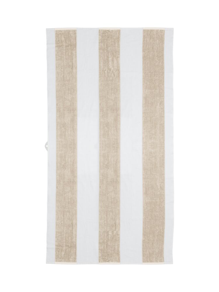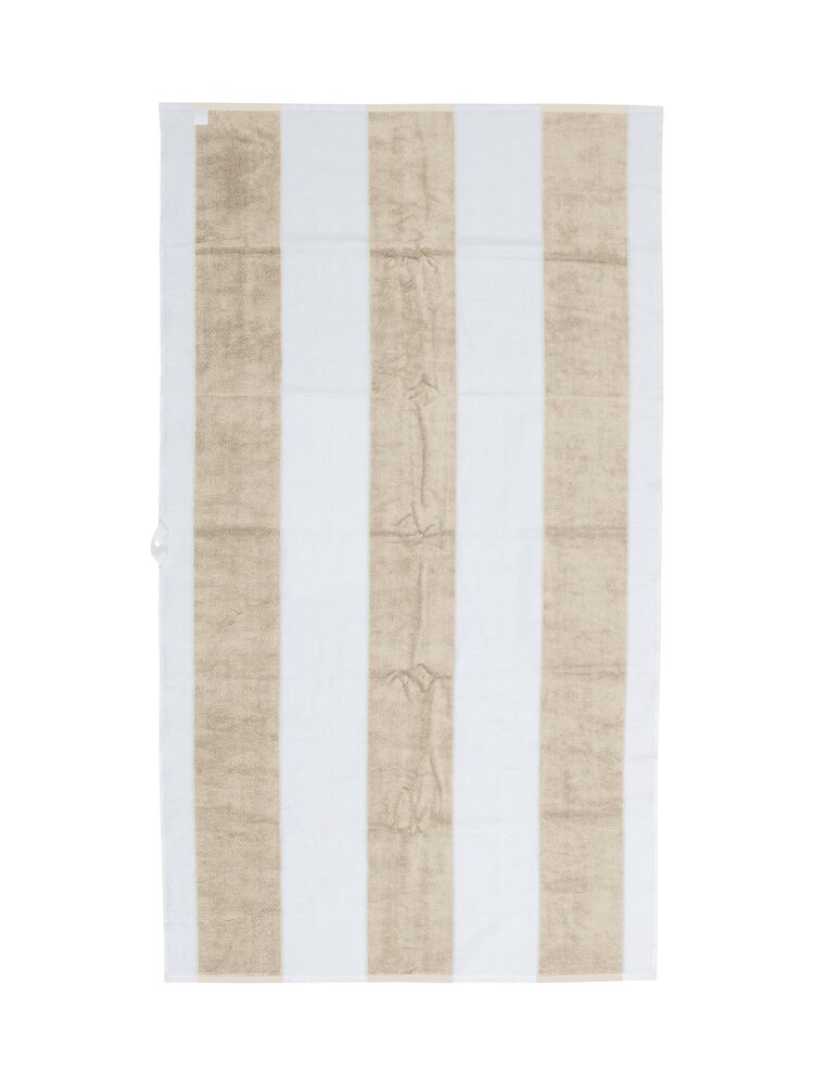 En klassisk strandhandduk i kraftig bomullsfrotté som tål sommarens alla äventyr. De breda ränderna ger en tidlös marin känsla och den generösa storleken gör den lika skön att ligga på som att svepa in sig i efter doppet. En självklar följeslagare från brygga till strand.