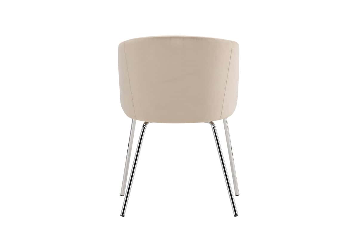 Berit är en elegant matstol med en tidlös design. Stolen har silverkromade stålben som ger ett modernt och stilrent intryck, samtidigt som de erbjuder stabilitet och hållbarhet. Sitsen är klädd i ett mjukt, beige velvetyg som både ser lyxigt ut och känns skönt att sitta på. Med sin rymliga och bekväma form är Berit perfekt för långa middagar, samtal och stunder du vill dröja dig kvar vid bordet.