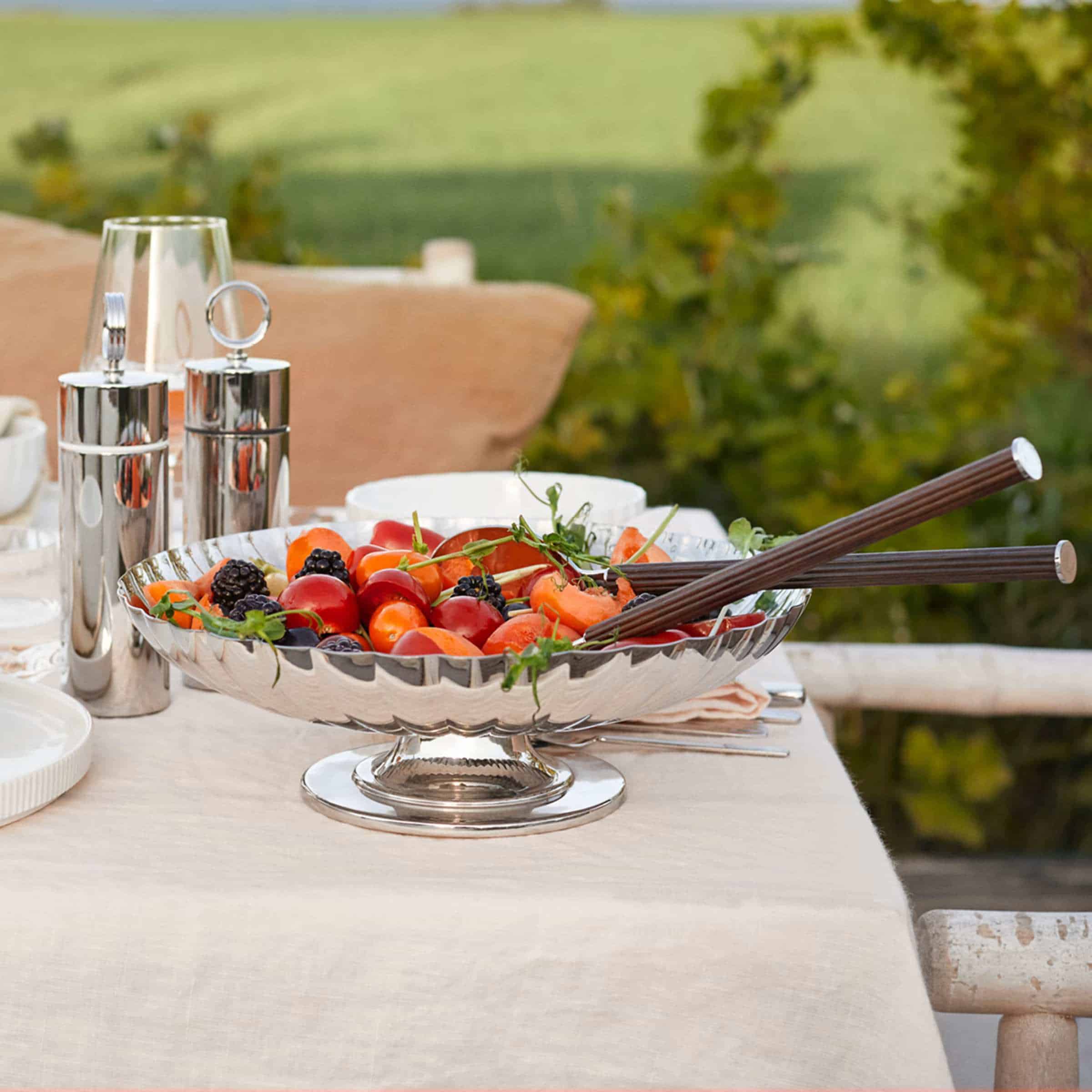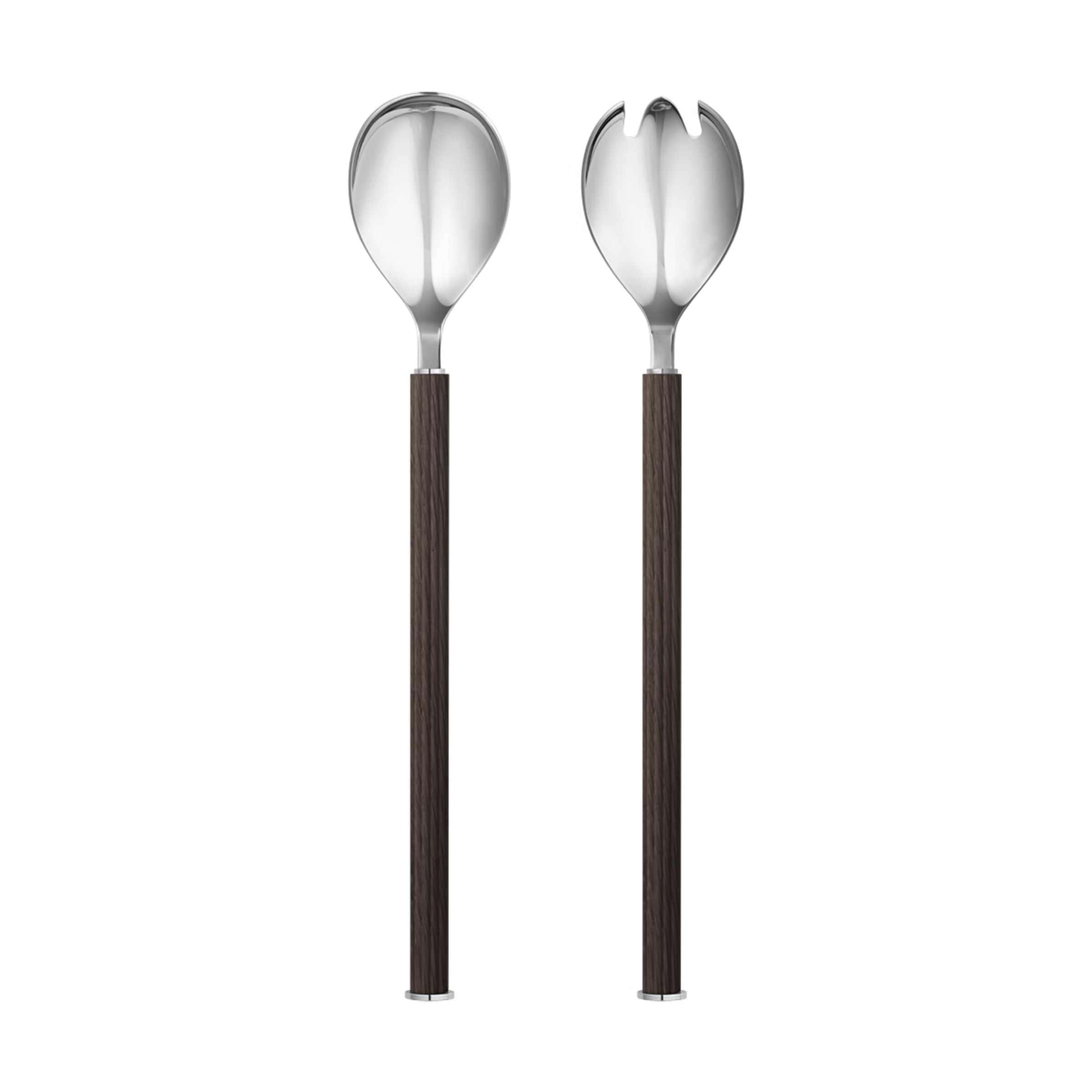 Servera salladen med stil! Dessa vackert designade salladsbestick är tillverkade i högblankt rostfritt stål och har handtag av rökt ek, och är skickligt utformade med en Art Deco-inspirerad siluett som tillför en elegant och lyxig känsla till måltiden. Med sin förmåga att balansera form och funktion är de den perfekta gåvan till värden eller värdinnan.