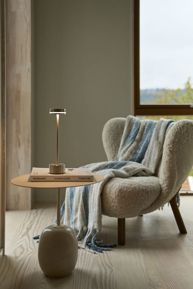 Stilren bordslampa i metall med mjukt ljus och laddningsbart batteri. Batteritiden är extra lång, upp till 30 timmar. Den gedigna konstruktionen och de rena linjerna gör lampan lika självklar på matbordet som på skrivbordet. Laddas enkelt via USB-C och sprider ett varmt, funktionellt ljus där du behöver det som mest. Utan sladdar och med ett minimalistiskt uttryck.