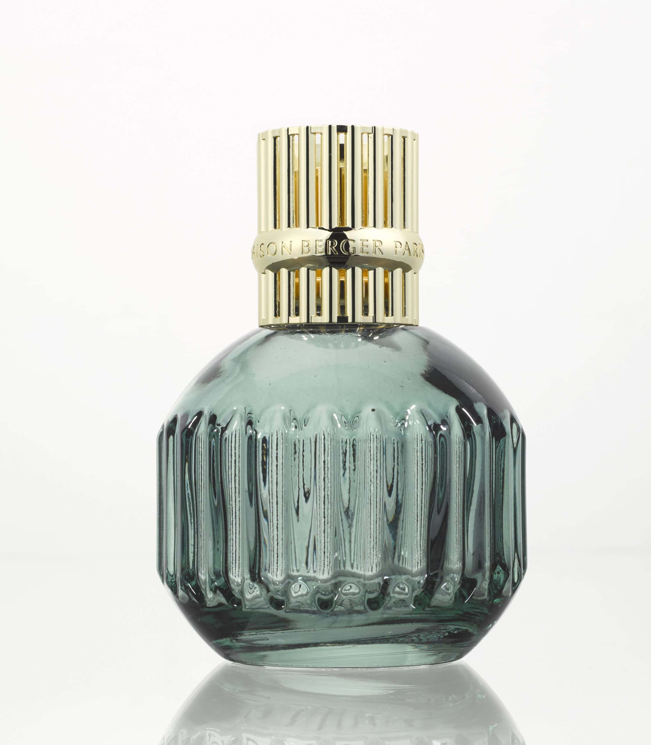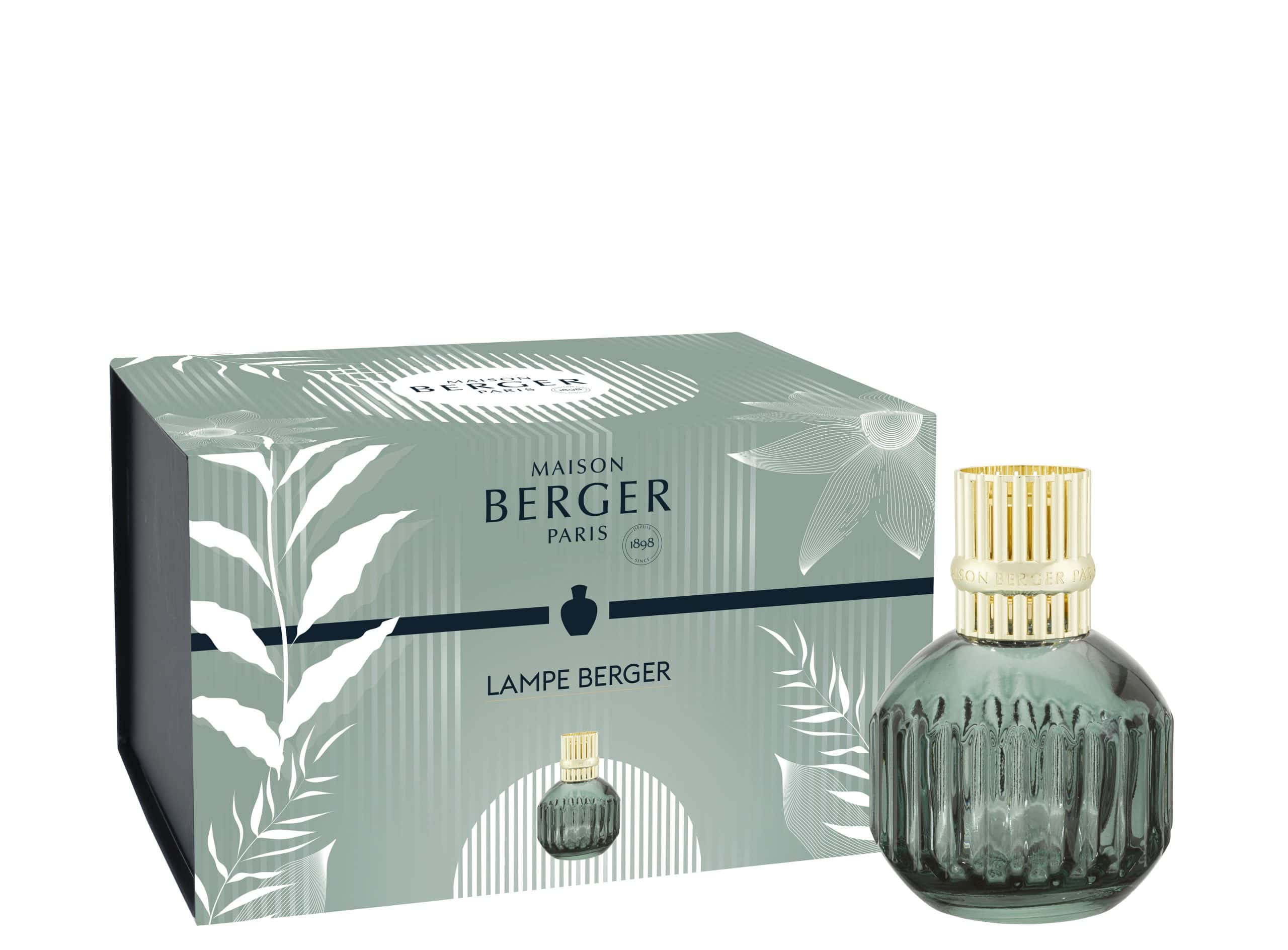 En grön något rundad form med räfflade mönstret som pryder kroppen och ramen., en bästsäljare hos Maison Berger Paris, tillför en känsla av mjukhet till dessa lampor.