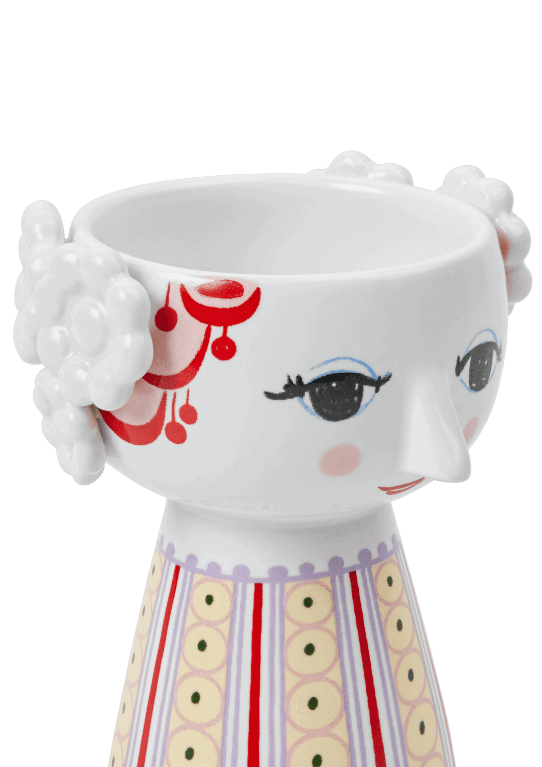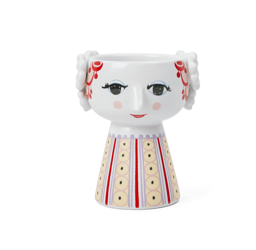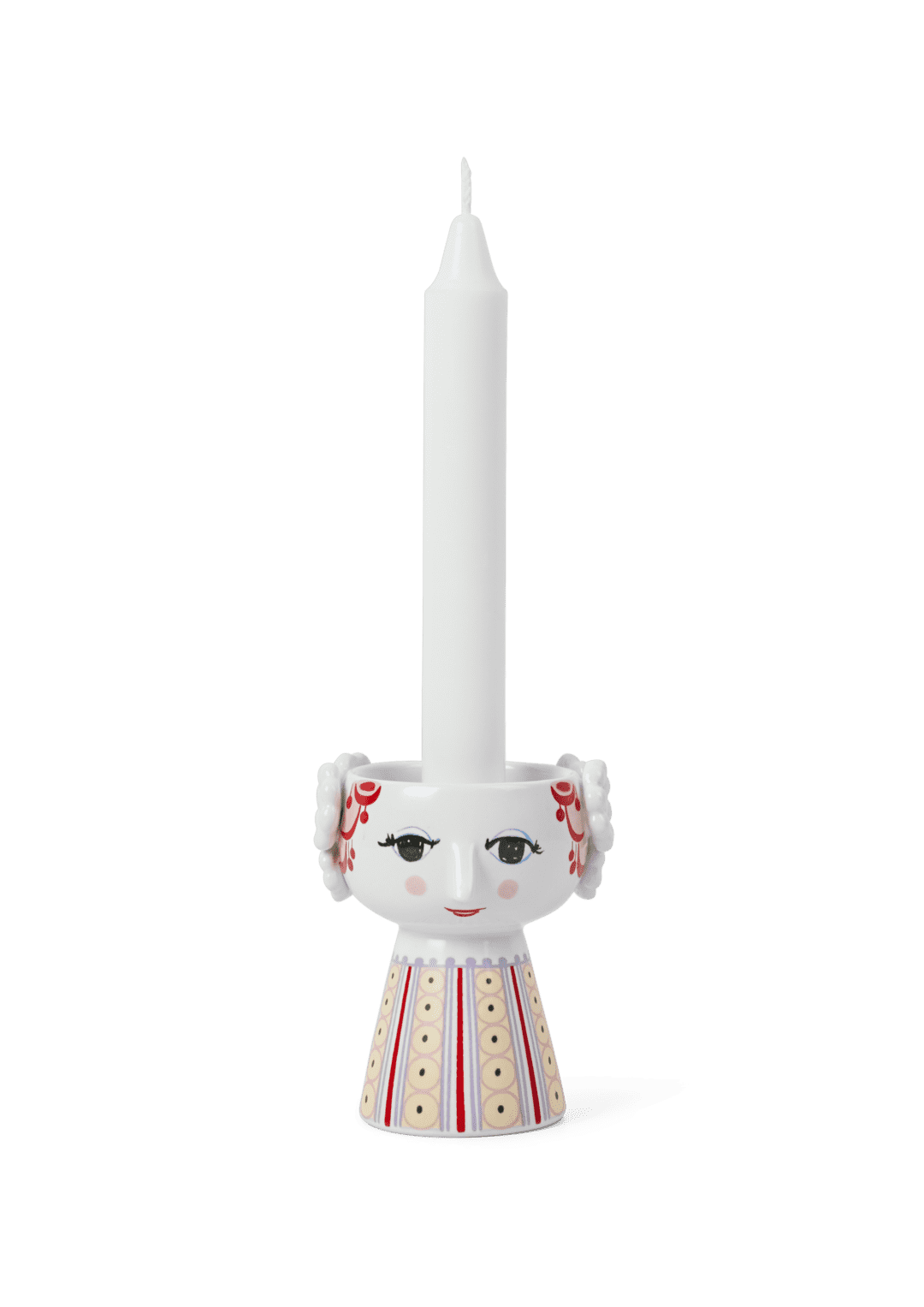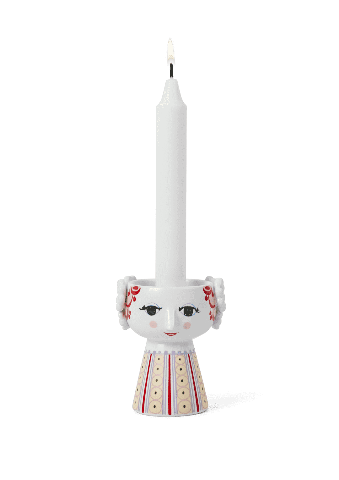 Bjørn Wiinblads stil är allt annat än minimalistisk. Den är överdådig, originell och underbar – och starkt definierad av livliga färger och ett unikt uttryck. Du hittar också många av hans roliga och konstnärliga dekorationer på hans Eva-ljusstakar. Designen är en äkta blandning av färger och geometriska former med en handritad känsla som på något sätt passar perfekt ihop. Och med den här vackra Eva-ljusstaken från Bjørn Wiinblad i en härlig lavendelnyans kan du pynta ditt hem med finurlig design. Ljusstaken är 9,5 cm hög och har en diameter på 8 cm. Den är dekorerad med rött hår och en färgglad lavendelklänning med rosa cirklar, gröna prickar och röda ränder. Eva-ljusstaken utstrålar en känsla av överdåd och är perfekt för både värmeljus och levande ljus – eller som en egen liten skulptural prydnad i din inredning. Eva-ljusstaken sprider glädje på bordet eller hyllan och ger din dag lite mer ljus och färg – i sann Bjørn Wiinblad-stil. Bjørn Wiinblad var en glad konstnär med en stor och färgstark personlighet som gjorde saker på sitt sätt och inte var rädd för att drömma och tänka stort. Hans anda framträder i den unika Eva som uppmuntrar oss att uttrycka vår egen stil och personlighet i vår inredning. En sak är säker: livet är aldrig tråkigt när Eva flyttar in.