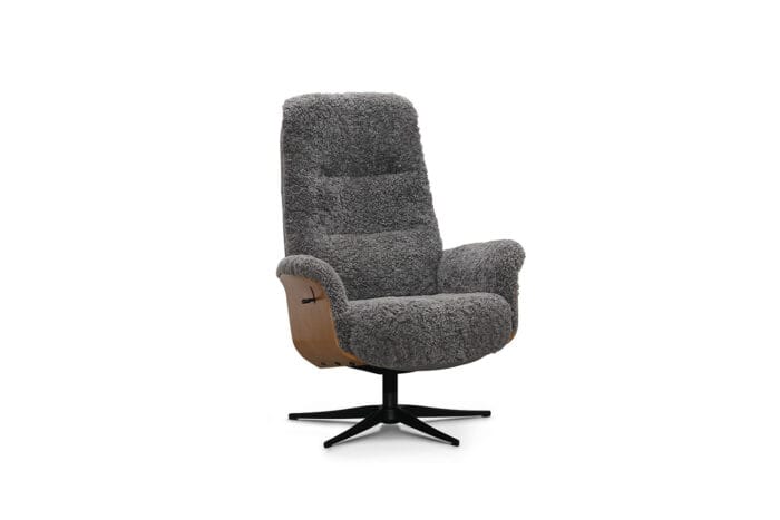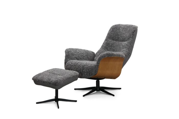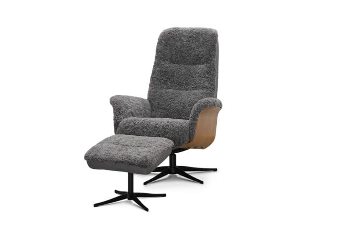 Fårö är en snurrfåtölj med ställbart ryggstöd som formas efter rygg och nacke när ryggen fälls bakåt. Detta ger Fårö en mycket god komfort. Fåtöljen har en separat fotpall. Fårö har ekfaner på armstöden. Finns i fårskinn/tyg.