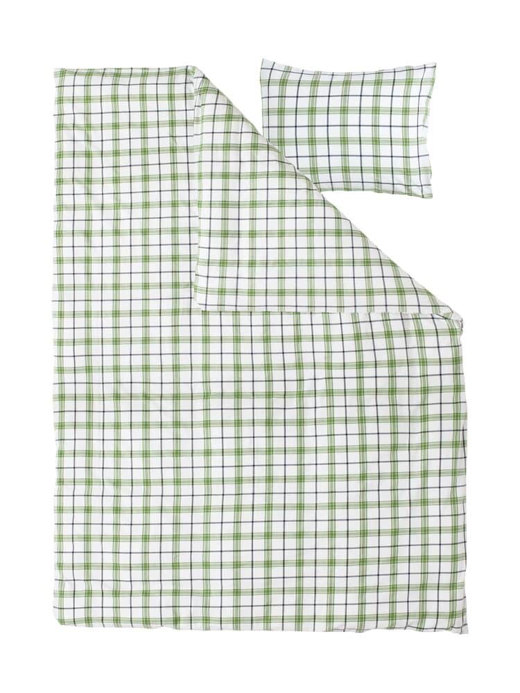 Bäddset i 100% återvunnet material. Klassiskt rutmönster i somrigt grönt med kontraster i marinblått på vit botten. Tillverkat i 70% återvunnen bomull och 30% återvunnen polyester. Trådtäthet 146.