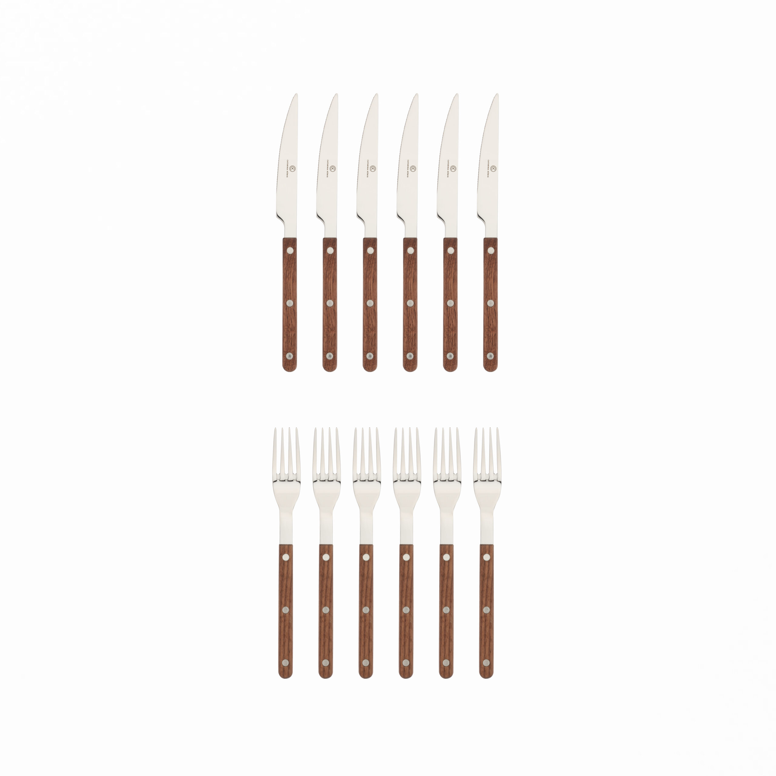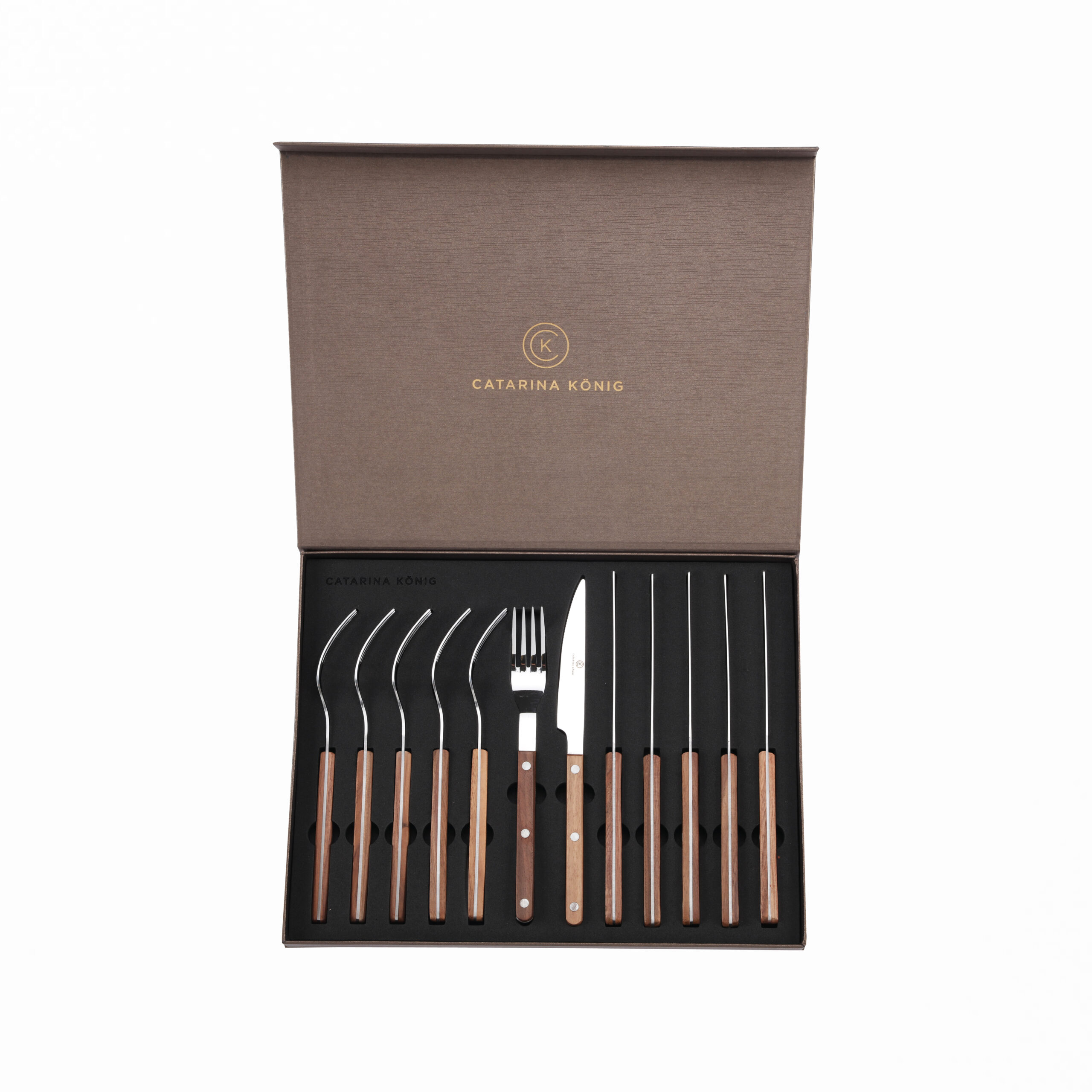Grillbesticken ur Wood Collection är ett elegant och stilrent 12-delars set som passar perfekt för grillkvällen. Tillverkade i högkvalitativt rostfritt stål samt vackra handtag i valnötsträ. Besticken kombinerar funktion med design och ger en varm, naturlig och exklusiv känsla till varje måltid. Ett gediget set som lyfter både vardag och fest – med guldkant. Levereras i en exklusiv presentkartong.