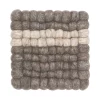 Grytunderlägg i ull med tovade bollar, för att skydda bordet mot varma kärl. Storlek 20x20cm.
