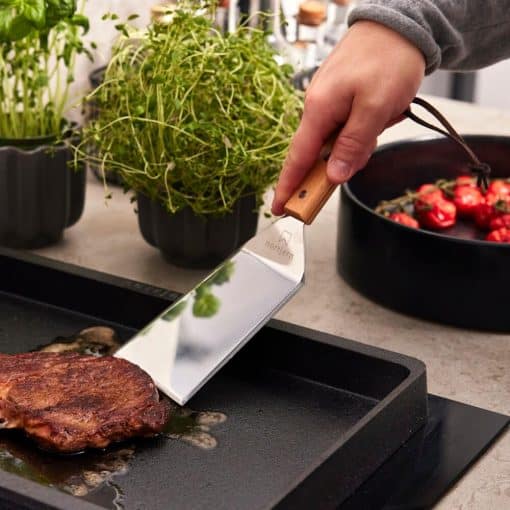 Vill du göra en perfekt smashed hamburger behöver du en stadig och bred hamburgerspade. Med vår hamburgerspade kan du både skrapa loss hamburgaren från stekbordet och vända den med enkelhet.