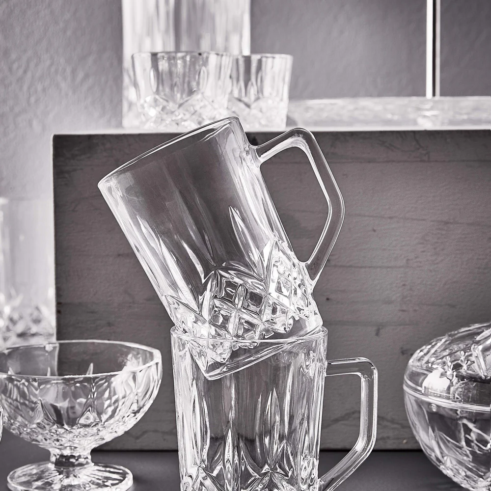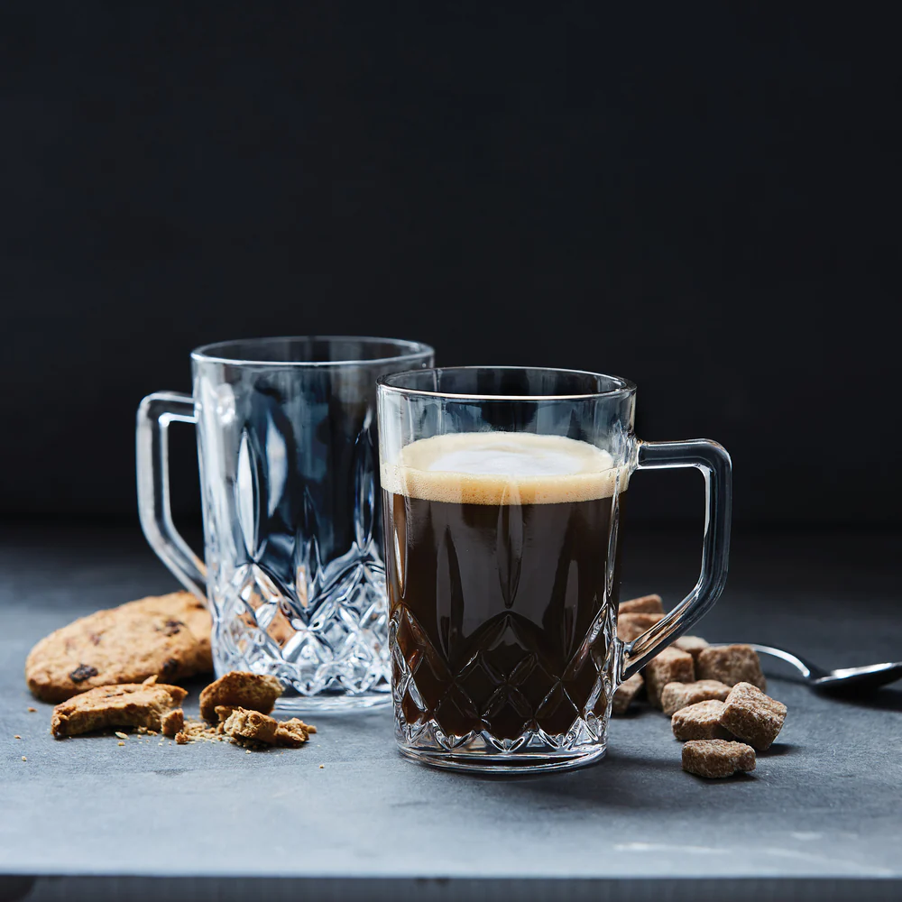 När du njuter av en varm dryck en kall dag gör Harvey-glaset för varm dryck upplevelsen ännu bättre. Inspirerat av klassiska kristallglas har det en fasetterad design som ger en lyxig touch till allt från kaffe och te till glögg och varm choklad. Det robusta handtaget säkerställer ett bekvämt grepp, medan det tjocka glaset behåller värmen. Harvey-glaset för varm dryck är tillverkat av sodaglas som tål maskindisk. För att bibehålla klarheten rekommenderas en skonsam diskcykel på låg temperatur.