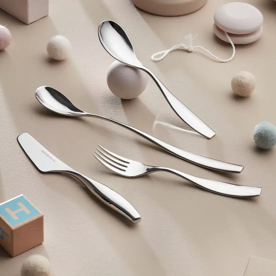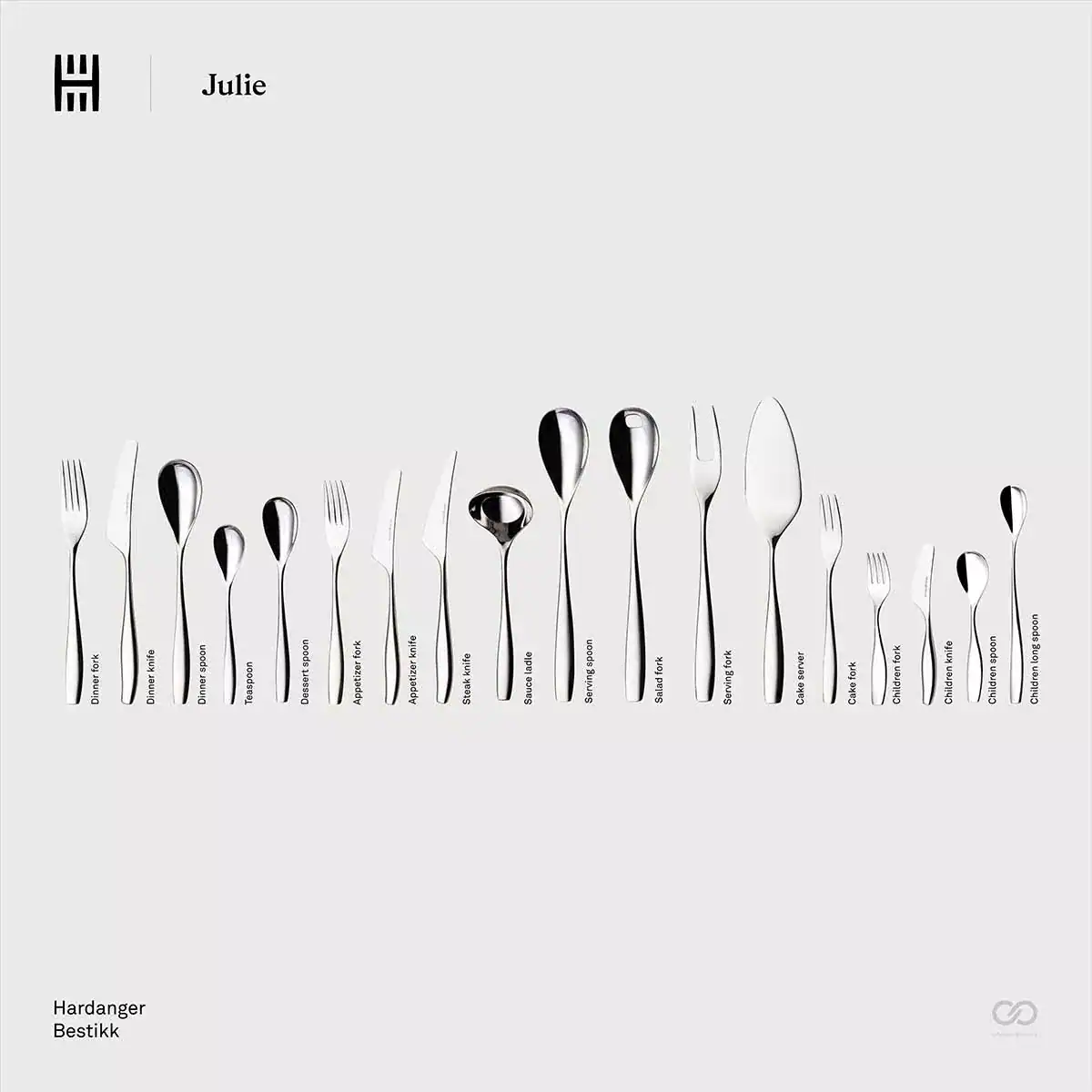 Barnbestick från den eleganta, naturinspirerade Julie-serien. Designat av Per Finne 2012. Barnbesticket är utformat precis som besticksetet är i serien, därmed blir barnen mer delaktiga och likvärdiga runt matbordet. Besticket har ett behagligt grepp och kommer att följa med barnet fram till de är 8-10 år. Levereras i presentlåda.