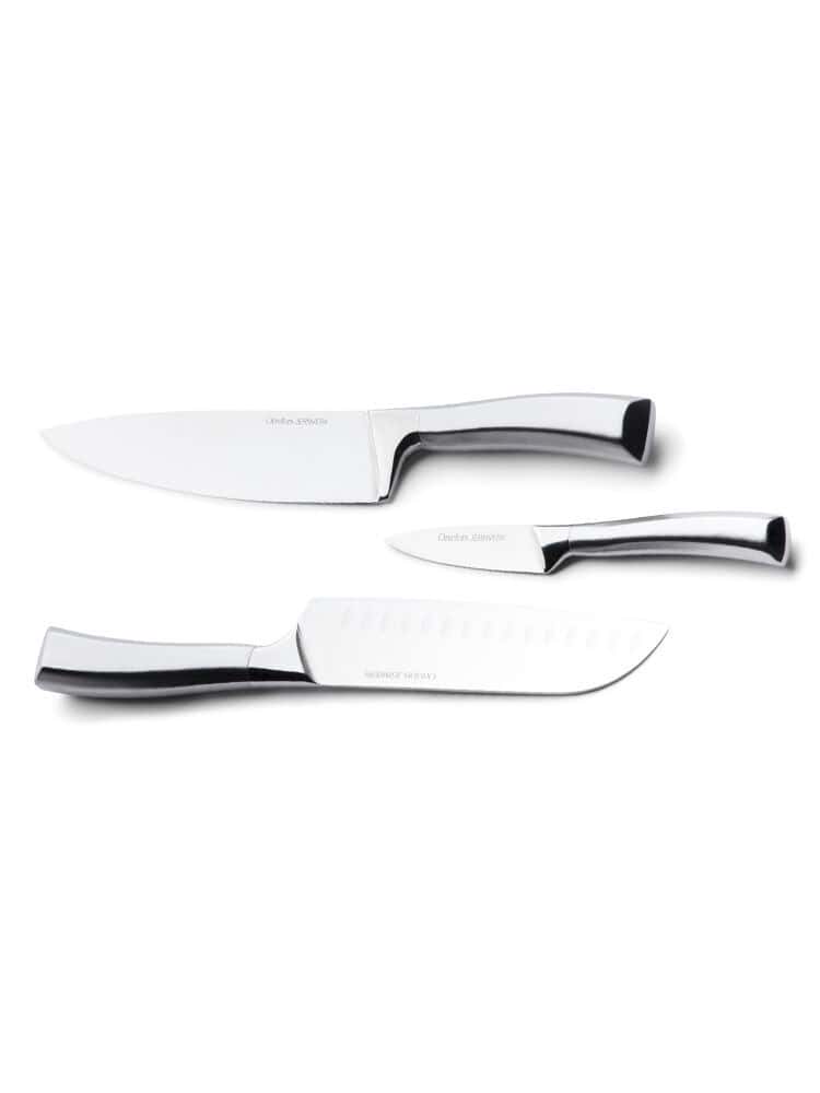 Knivset av stål bestående av skalkniv, kockkniv och en santokukniv. Storlek bladet: skalkniv 8 cm kockkniv 20 cm santokukniv 17 cm