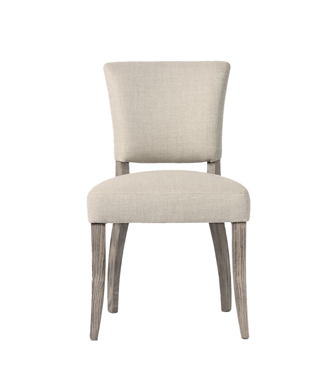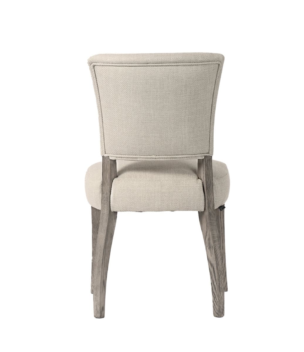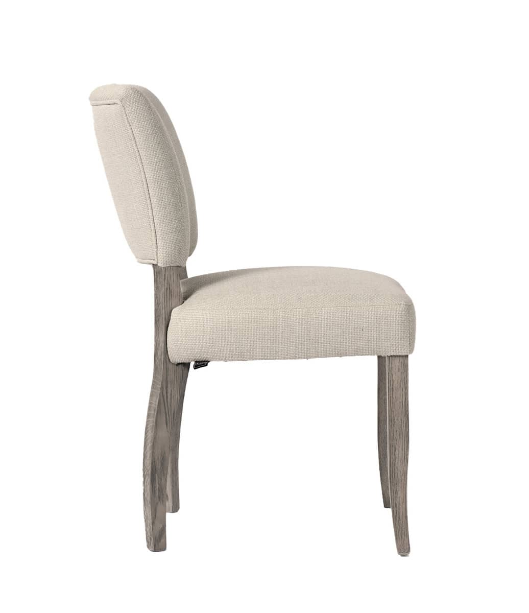 Den mjukt vadderade sitsen och den lätt böjda ryggen gör stolen bekväm även vid längre måltider. Benen i massivt trä skapar en fin kontrast mot det beige tyget och förstärker det moderna uttrycket.