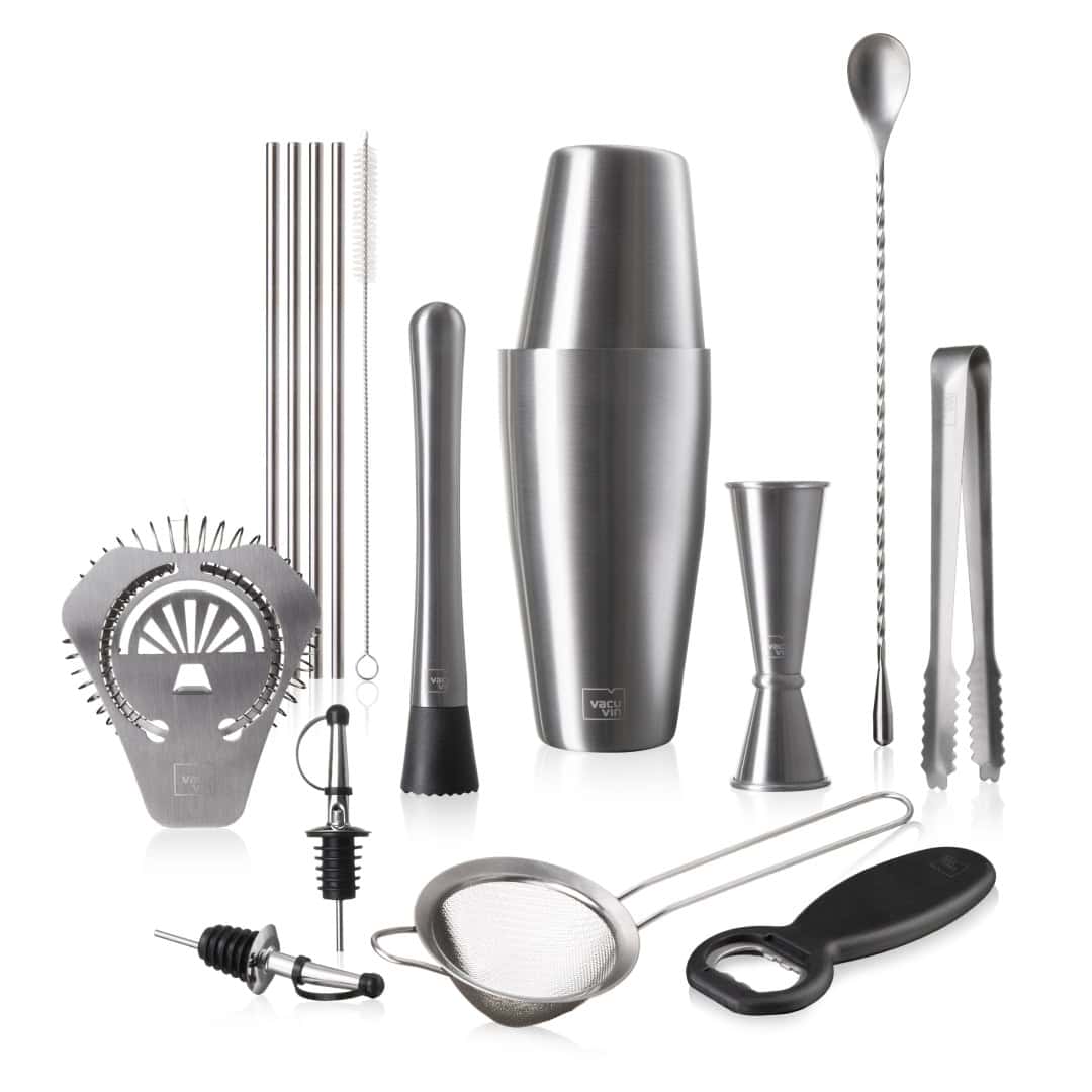 Komplett cocktailset med 14 barverktyg för att skapa skakade och omrörda cocktails med stil. Det är den perfekta presenten till alla cocktailälskare. Hållbar kvalitet: Tillverkad av förstklassigt rostfritt stål och utvecklad i samarbete med en proffsbartender. Inkluderar ett recepthäfte: Lätta att följa cocktailrecept som du kan prova hemma. Kanalisera din inre hemmabartender med verktyg från Vacu Vin och recept från cocktail pro. Blanda, skaka, fira!