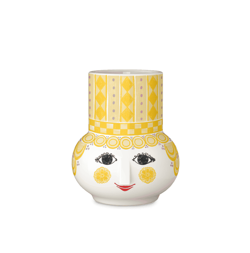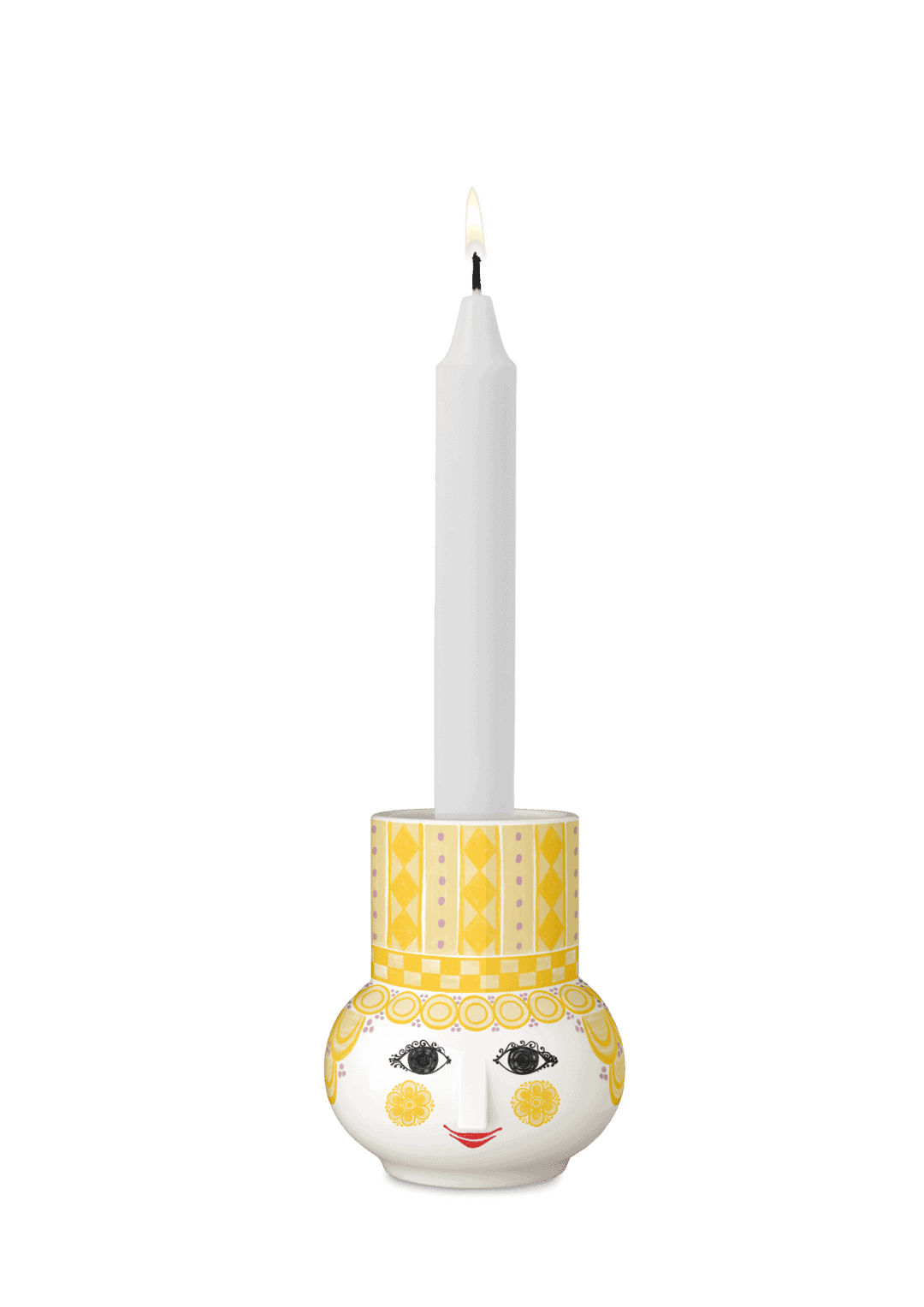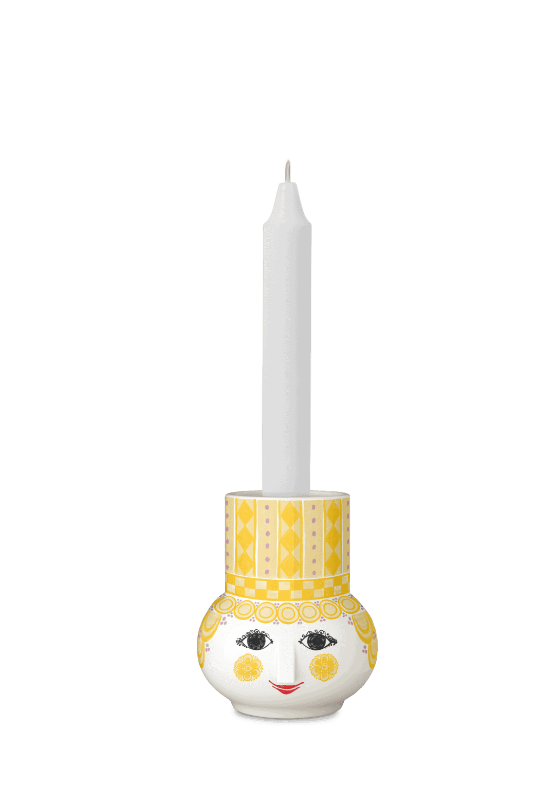 Vik ut din färgstarka personlighet och skapa plats för glädje med Bjørn Wiinblads Olga. Med sitt söta leende, färgstarka kinder och karaktärsfulla dekorationer förkroppsligar Olga själva essensen av Bjørn Wiinblad som person och konstnär – även när hon tar form som en ljusstake. Glad och drömsk sprider hon liv och personlighet i inredningen med sitt poetiska uttryck och sina livfulla färger. Olga-ljusstaken har samma runda form och cylindriska topp som vaserna i Olga-serien, som såg dagens ljus 2024 som en nytolkning av en ikonisk vas från Bjørn Wiinblads imponerande designarkiv. Ljusstaken pryds av ett sött runt ansikte med mandelformade ögon och den ikoniska trekantiga näsan – nästan själva personifieringen av Bjørn Wiinblads konst. Den lilla ljusstaken i serien, som passar både värmeljus och kronljus, är 9 cm hög och sprakar av färg i en klar gul nyans med ljusgula toner och lavendelfärgade prickar. Alla Olga-ljusstakar är tillverkade av blankglaserad keramik med färgglada dekaler, och dekorationerna är en fantastisk blandning av originalmönster från Bjørn Wiinblad, presenterade i en varierad färgpalett som ger ett modernt och fräscht uttryck. Bjørn Wiinblad var en livsglad konstnär med en stor och färgstark personlighet, som gick sin egen väg och inte var rädd för att drömma stort. Den själen lever vidare i Olga, som utstrålar självförtroende och inspirerar oss att uttrycka vår egen stil och personlighet genom dekorationer inspirerade av Bjørn Wiinblads originalkonstverk. En sak är säker: Det blir aldrig tråkigt när Olga flyttar in.