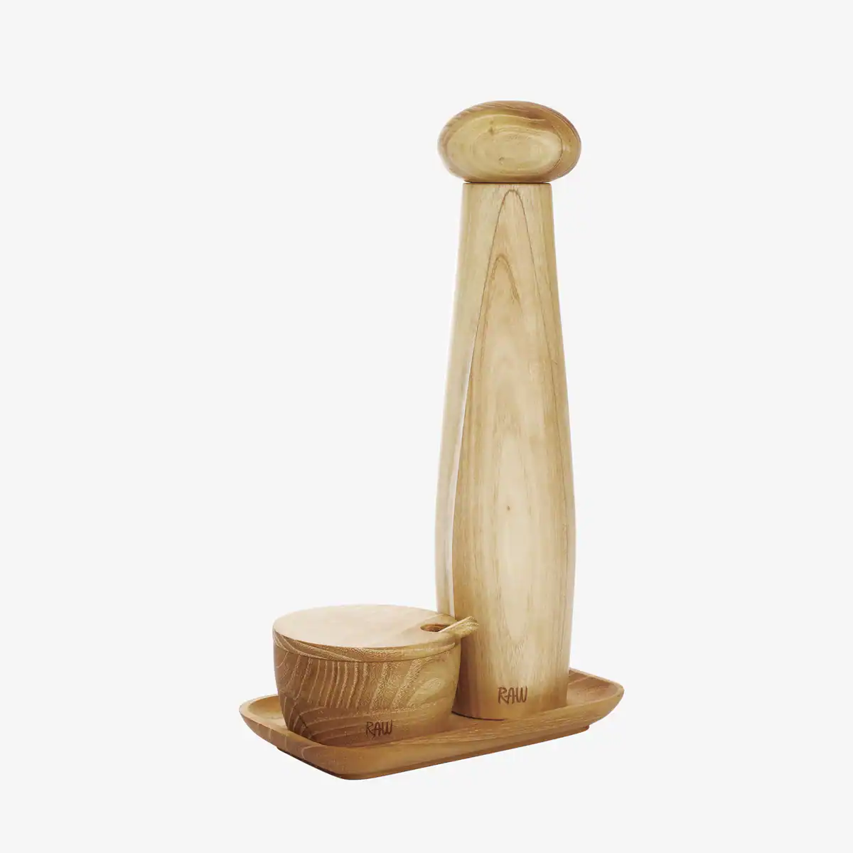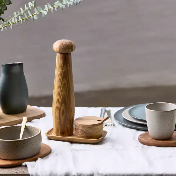 Detta vackra set är det perfekta tillskottet till ditt nordiska kök. RAW Teak keramiska pepparkvarnset med bricka och saltkar inkluderar en hög RAW Teak keramisk pepparkvarn, en RAW Teak bricka och en RAW Teak saltkar. Setet är tillverkat av det extremt hållbara och vackra teakträet och är därför inte bara praktiskt, utan kan även pryda köksbordet. Som en del av RAW-universumet matchar RAW Teak keramiska pepparkvarnset med bricka och saltkar allt från det råa stengodsetet och eleganta glasen till de snygga besticken och mjuka linnetextilierna.