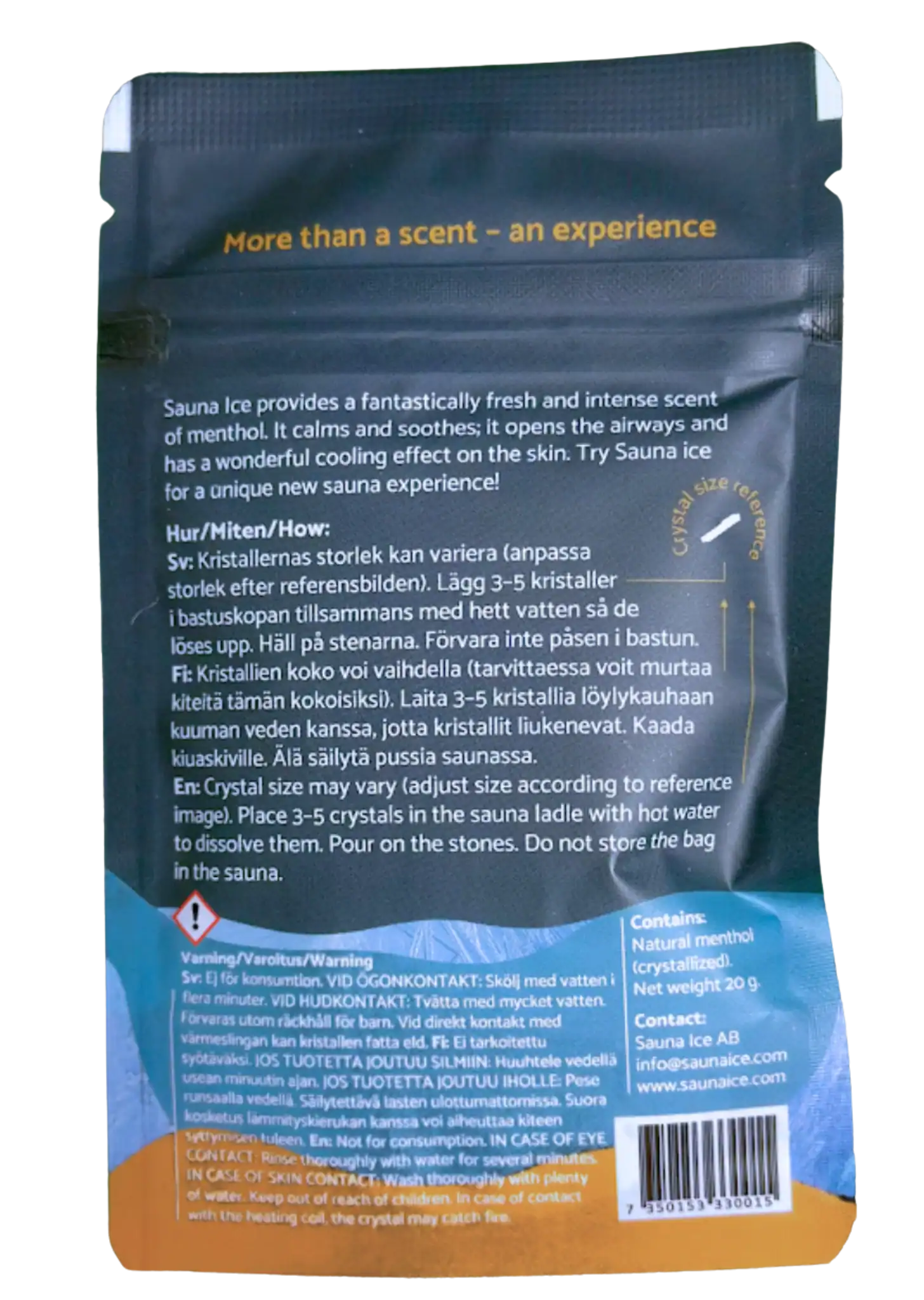 Upplev kraften i 100% naturliga mentolkristaller. Sauna Ice öppnar luftvägarna, svalkar huden och förvandlar din bastu till en fristad för återhämtning.