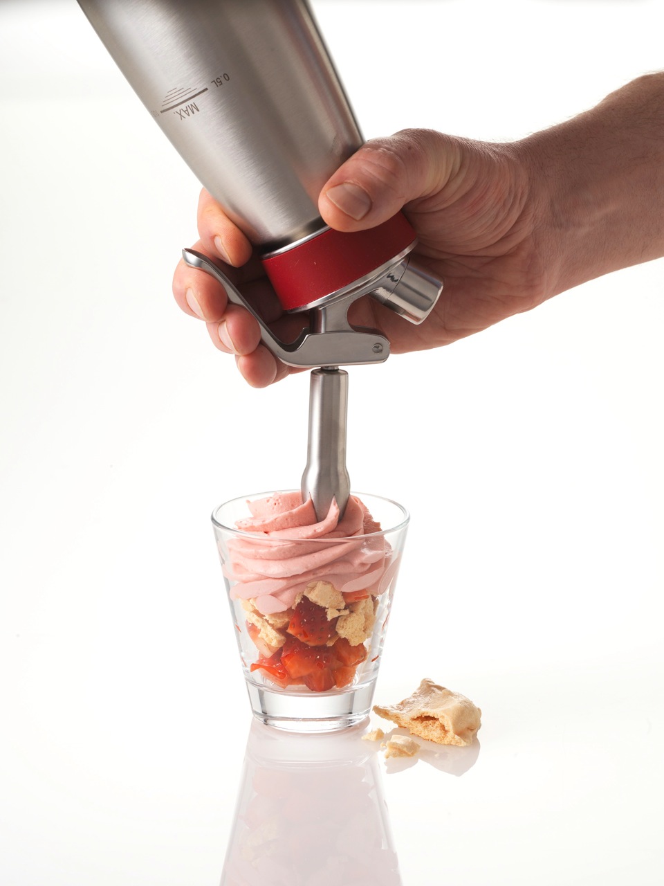 Locket har ett ergonomiskt silikongrepp och en avtagbar ventil för enkel rengöring. Laddas med iSi PRO Patron.