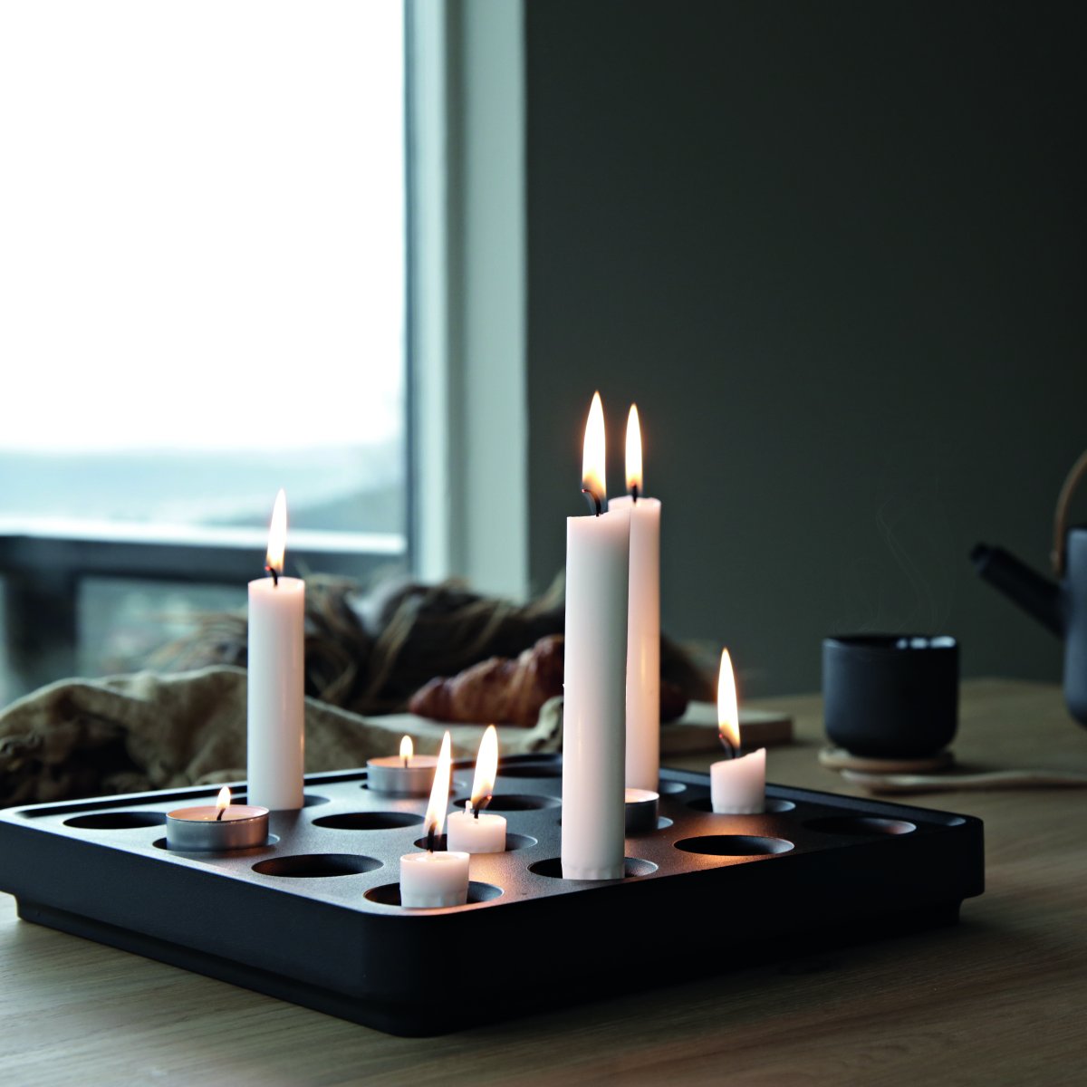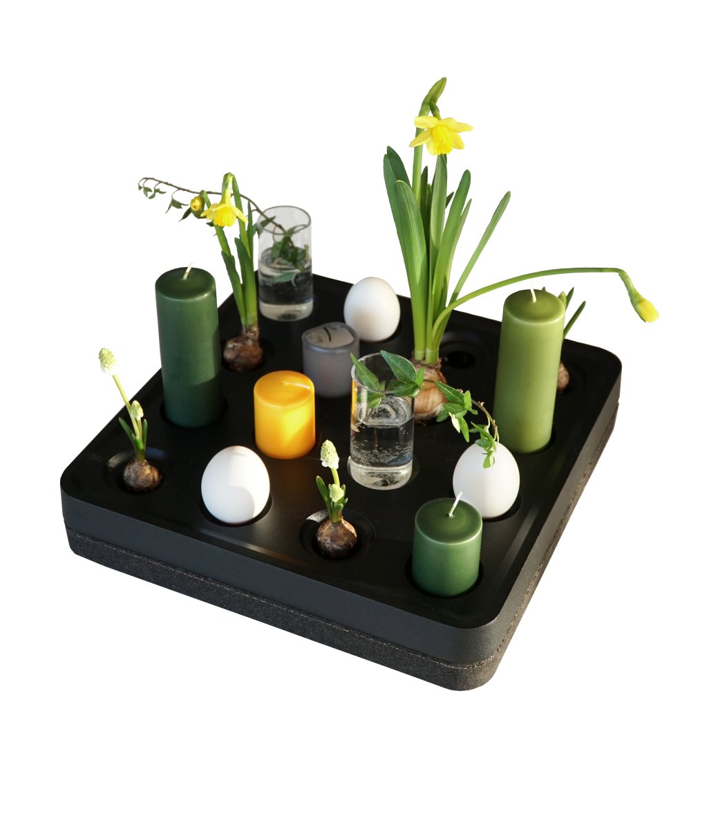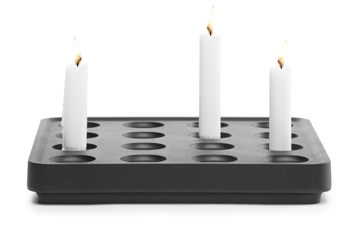 Den största modellen har plats för hela 16 ljus och kan enkelt anpassas med olika tillbehör. Lägg till det praktiska gallret för att hålla tekannan varm eller komplettera med eleganta minivaser för att skapa en vacker kombination av ljus och blommor. För att skydda underlaget finns ett korkfat i antingen naturlig eller svart kork.