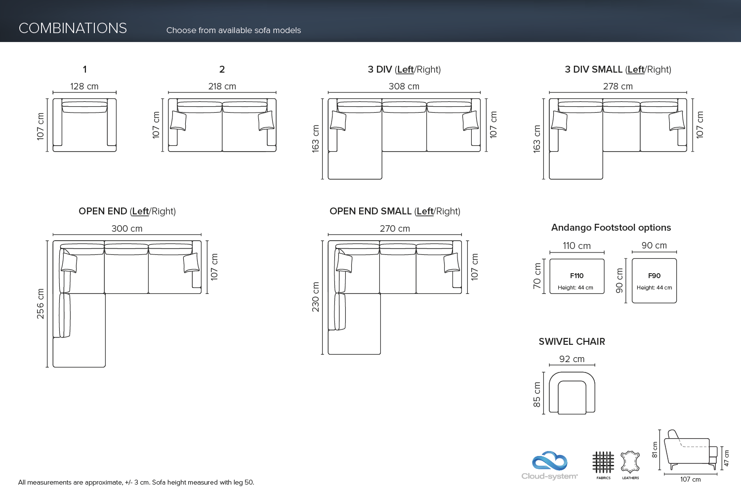 Andango kommer i olika enheter och finns i ett brett utbud av tyger och läder.