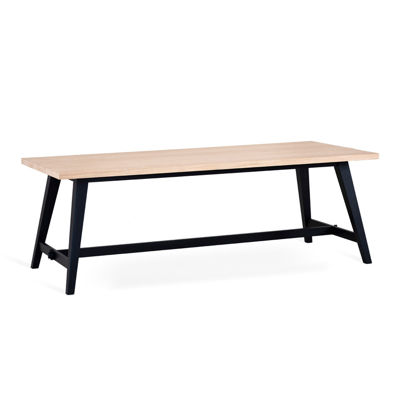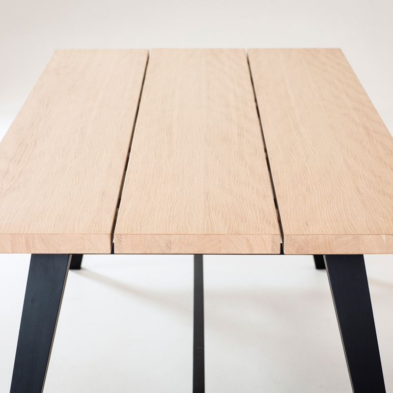 Bedrock matbord med sin tredelade bordsskiva i vitoljad fanerad ek. Underredet är i svartlackat trä. Bordet har möjlighet att köpa till tilläggskiva på båda sidor och kan färlängas till hela 320 cm.