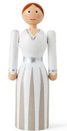 Kay Bojesens brud är originalet och klassiskt danskt trähantverk när det är som bäst – designat i Bojesens ikoniska runda former med en välbekant glimt i ögat. Bruden är 17 cm lång och har en hellång vit klänning med långa ärmar och feminina silverdetaljer i form av ett knytband runt midjan och vid handlederna. Med en tunn linje har de tunna ränderna målats på klänningen, vilket ger den en känsla av rörelse och struktur. Den här detaljen framhäver figurens mjuka form och ger den vita klänningen en extra dimension. Håret sveps tillbaka i en enkel frisyr och precis som Kay Bojesens originalfigurer är kinderna röda och leendet vänligt och välkomnande. Figuren är tillverkad av FSC-certifierad bok och tillverkad i samma höga kvalitet som Kay Bojesens träfigurer är kända för. Ge bruden i present under hennes möhippa eller låt den eleganta figuren hitta sin väg till presentbordet tillsammans med sin partner.