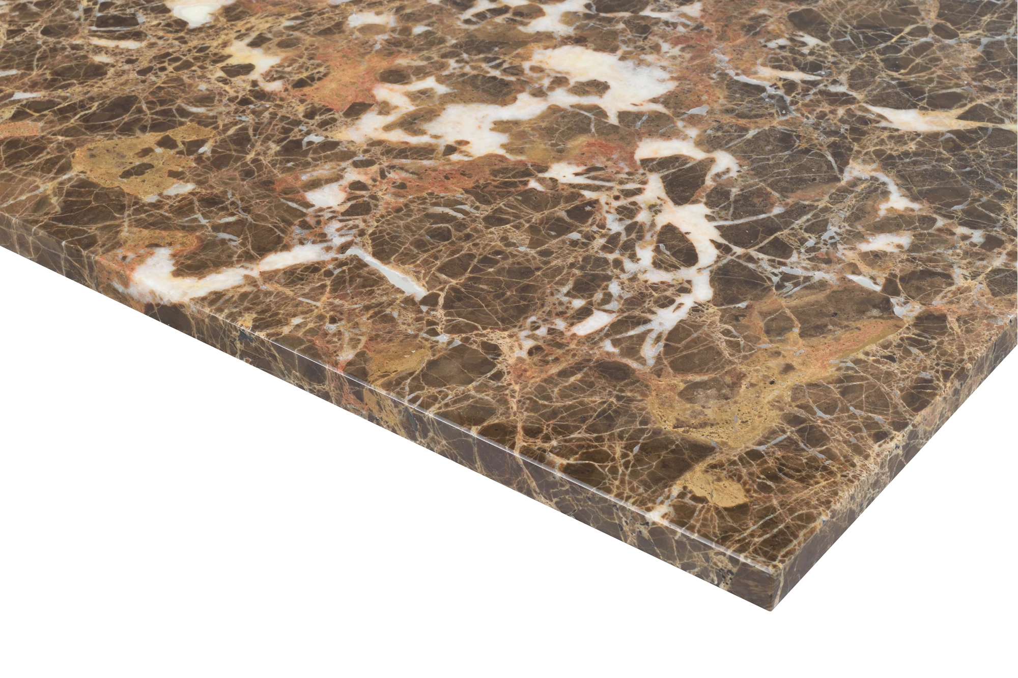 Topp i äkta marmor (brun Emperador), låsklotsar i MDF, ben i MDF med ekfanér, lackat utförande.