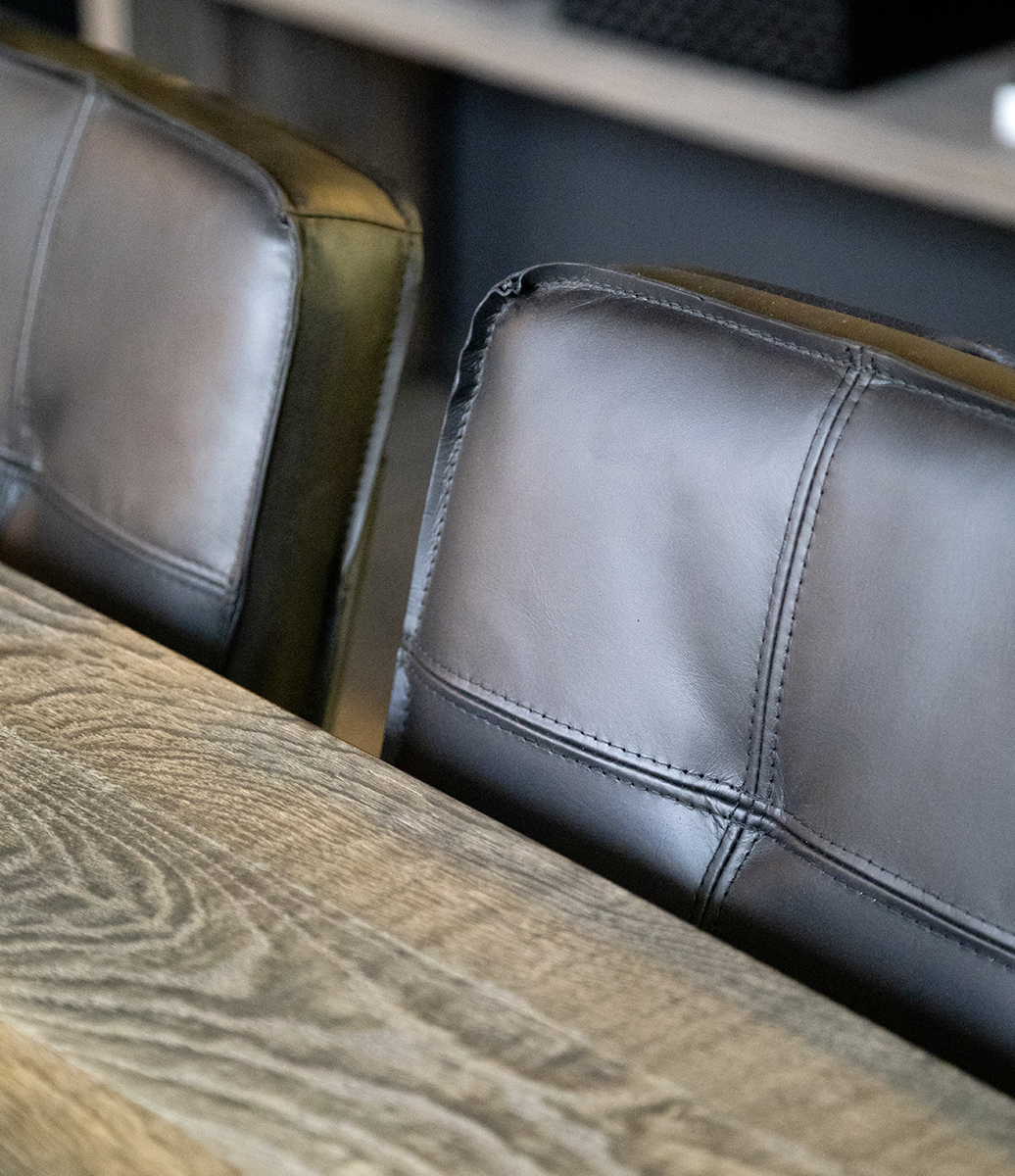 Buffalo leather matt black taupe. Natural iron.Stomme i plywood. Fyllning med skumfiber.