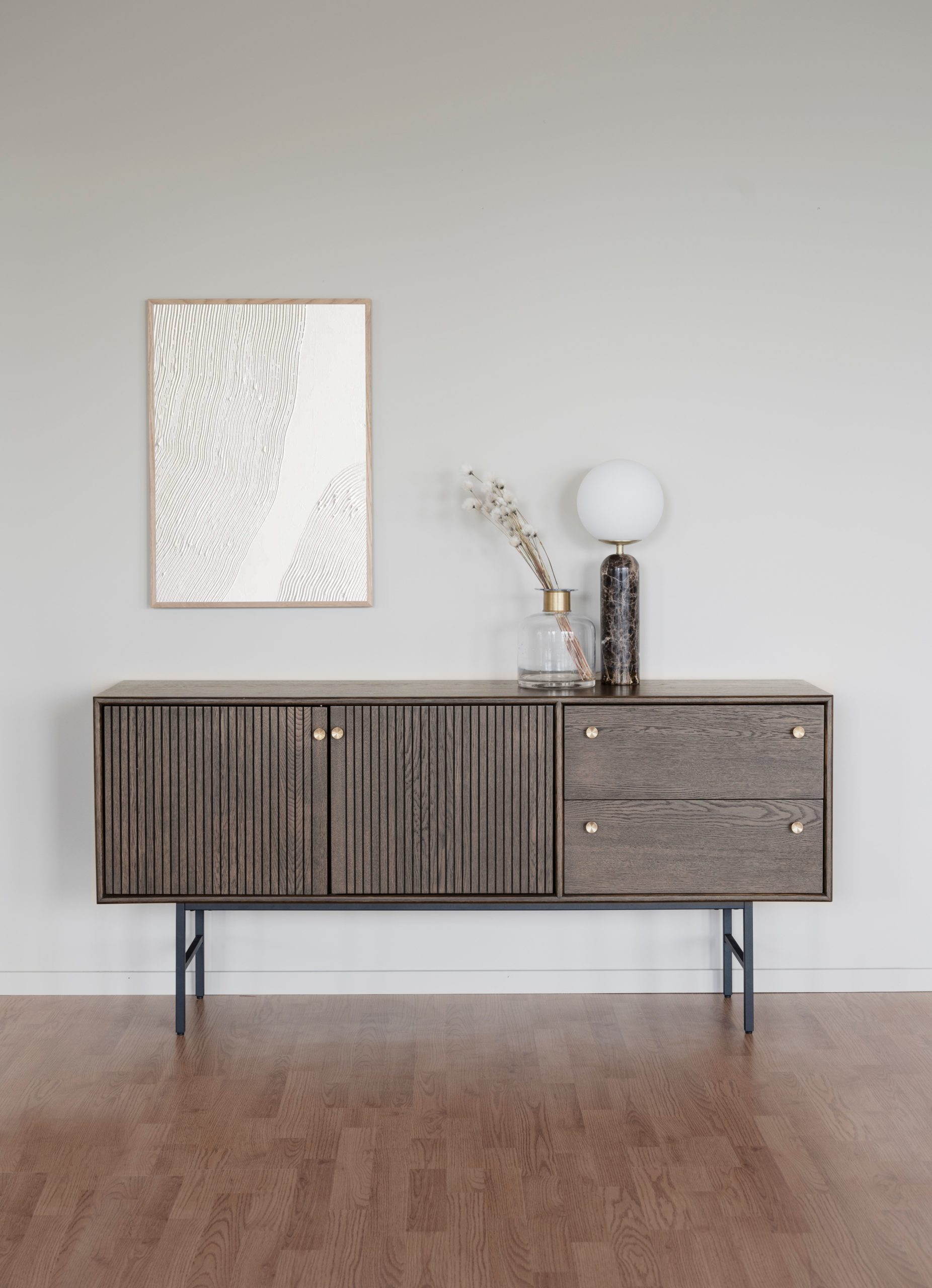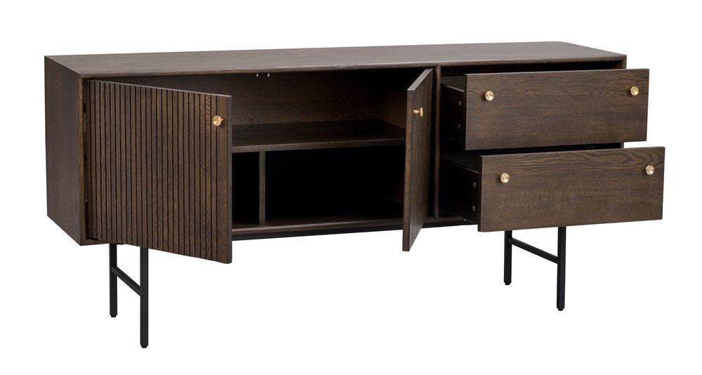 sideboard i en lackad brun ekfärg med svarta metallben. Skänken är i brunbetsad ekfanér med massiva kanter och har en hylla av trä innanför dörrarna. Sideboardet har praktiska lådor på ena sidan och mässingsfärgade beslag. Det ingår även ett skåp i serien.