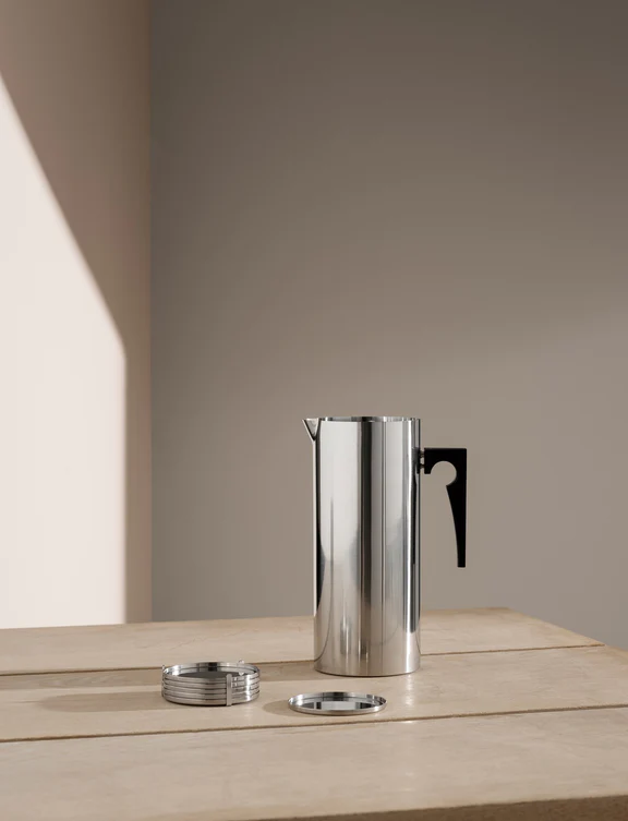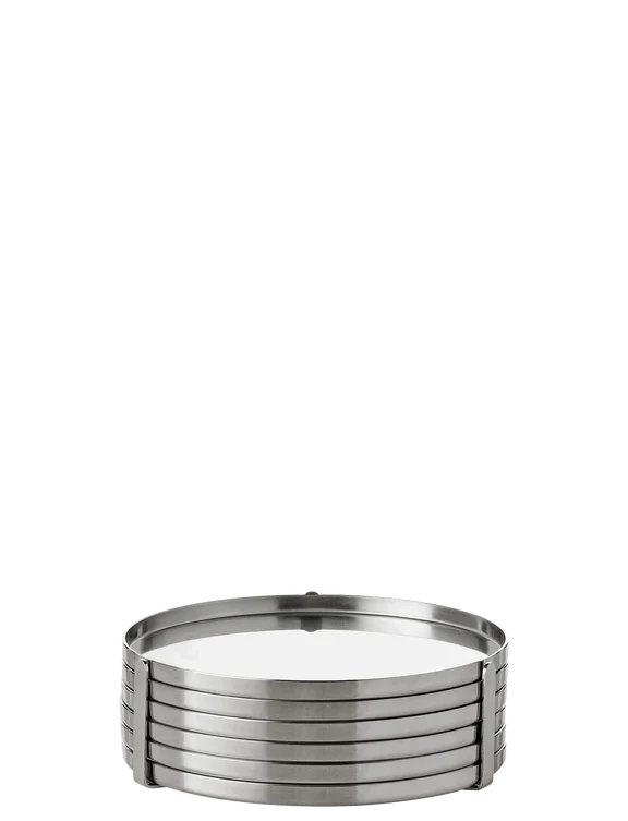 Cylindrisk elegans för ditt glas med denna uppsättning glasunderlägg designad av Arne Jacobsen. Setet består av sex glasunderlägg och en diskret hållare där underläggen kan staplas när de inte används. Underlägget är tillverkat av rostfritt stål och har en diameter på 8,5 cm. Använd dem alltid för att undvika dropp och glasringar på bordet.