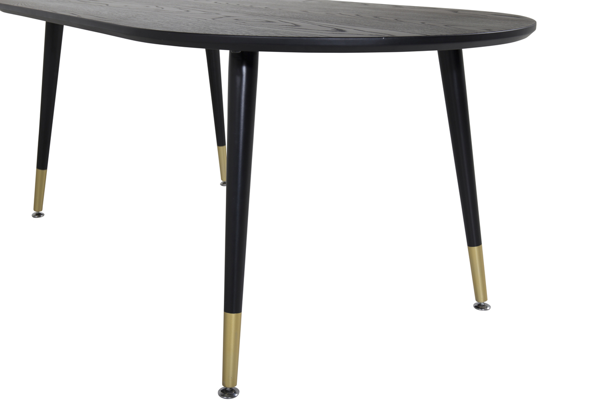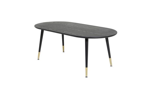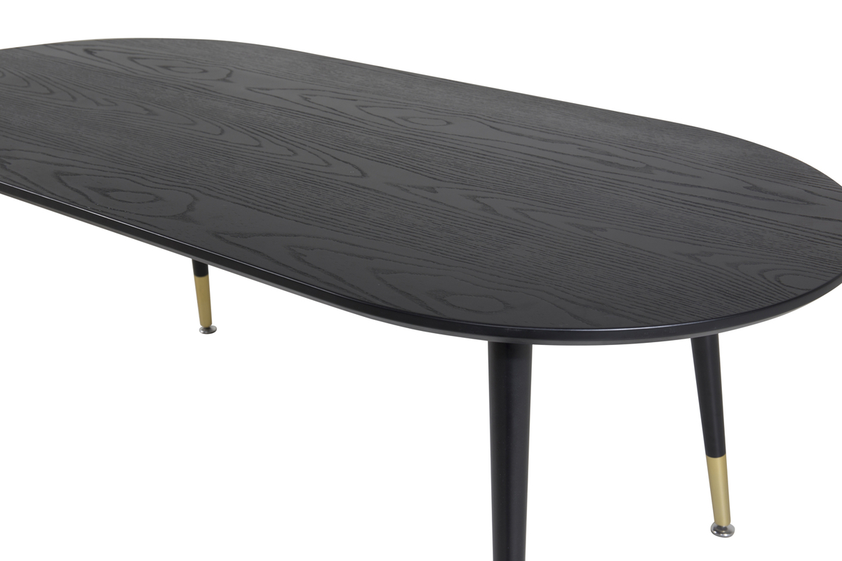 Soffbordet Dipp i en oval form är perfekt om du vill skapa en social och inbjudande atmosfär i vardagsrummet! Bordet har en svart bordsskiva i en lätt mönstrad MDF med faner och svart ben i stål. De mässingfärgade bensluten har en unik förmåga att skapa känslan av lyx, vilket tar detta bord till nästa nivå. Utnyttja den generösa platsen för vackra dekorationer och skapa ett vardagsrum att trivas i!