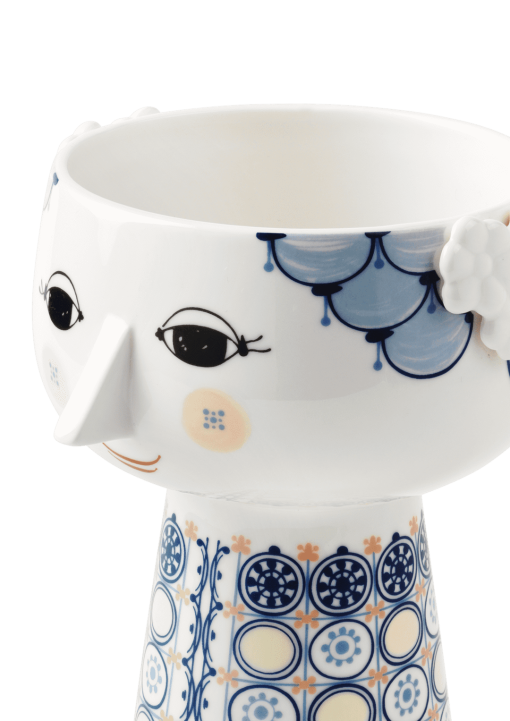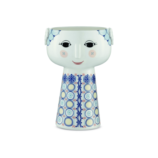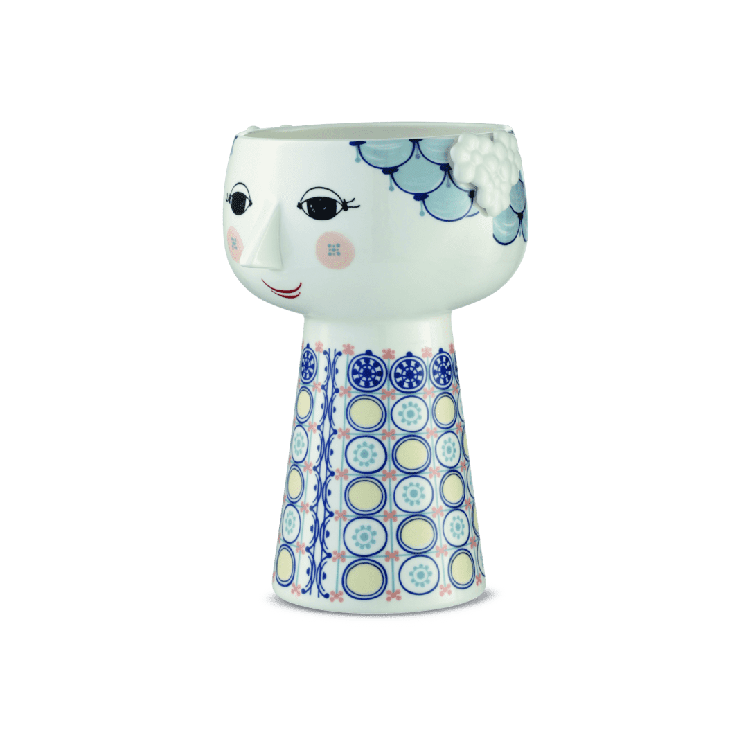 Den fantastiska EVA-vasen av Bjørn Wiinblad kommer i en härlig blå nyans. Vasen är 18 cm hög och 11 cm i diameter, vilket gör den perfekt för vackra buketter eller en enda stor blomma. Vasen är gjord av glänsande glaserat porslin med färgad dekal och är inspirerad av Wiinblads original EVA-vaser, som hade breda huvuden och en konisk kropp. Det känsliga ansiktet är från Wiinblads ursprungliga konturer, och klänningsmönstret kommer från Wiinblads konstverk.