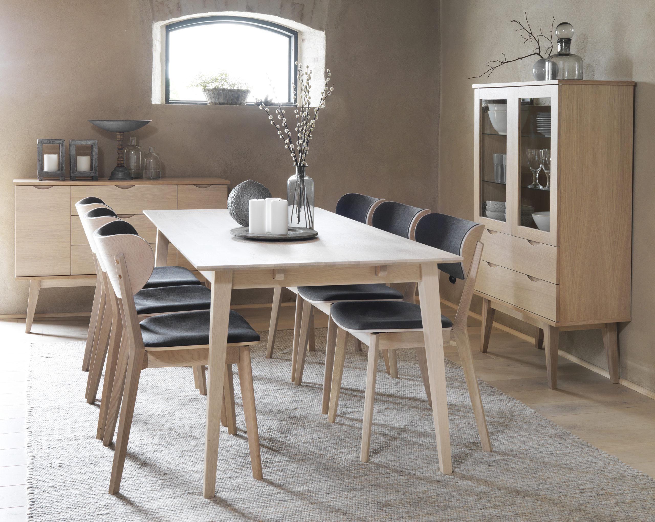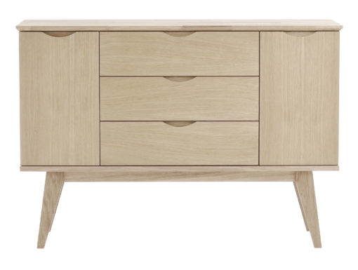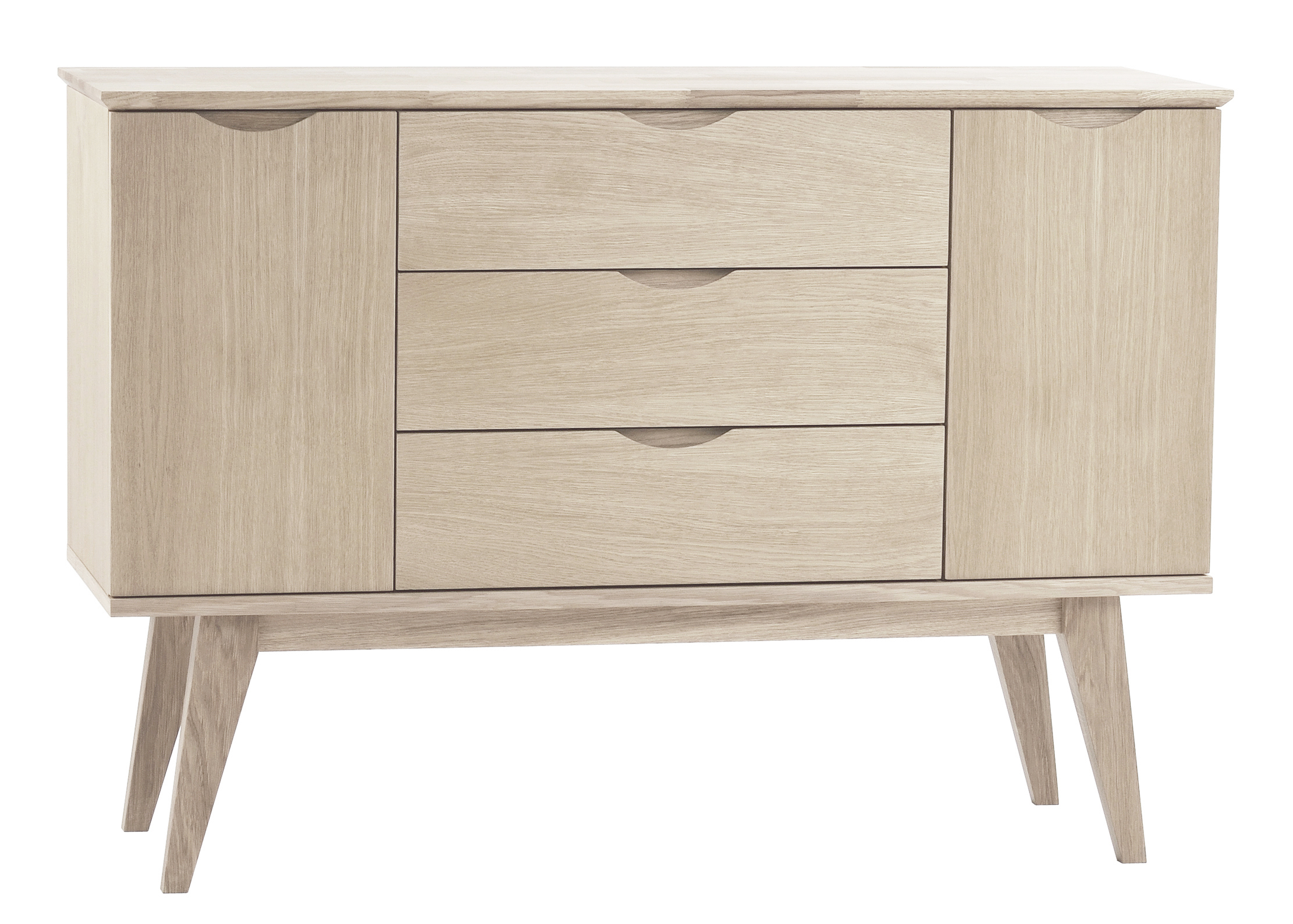 Stilrent sideboard med generös förvaring. Skåpet är i vitpigmenterad ek och har tre mjukstängande lådor och två luckor. Benen är lätt utställda vilket ger ett modernt uttryck. Sideboardet ingår i vår serie Filippa.