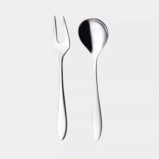 Serveringsset från den skandinaviska, cirkelformade Fjord-serien. Serveringsskeden och serveringsgaffeln har greppvänliga handtag och precisa egenskaper. Långa tänder på gaffeln gör den väl lämpad för hantering av kött. Levereras i presentförpackning.