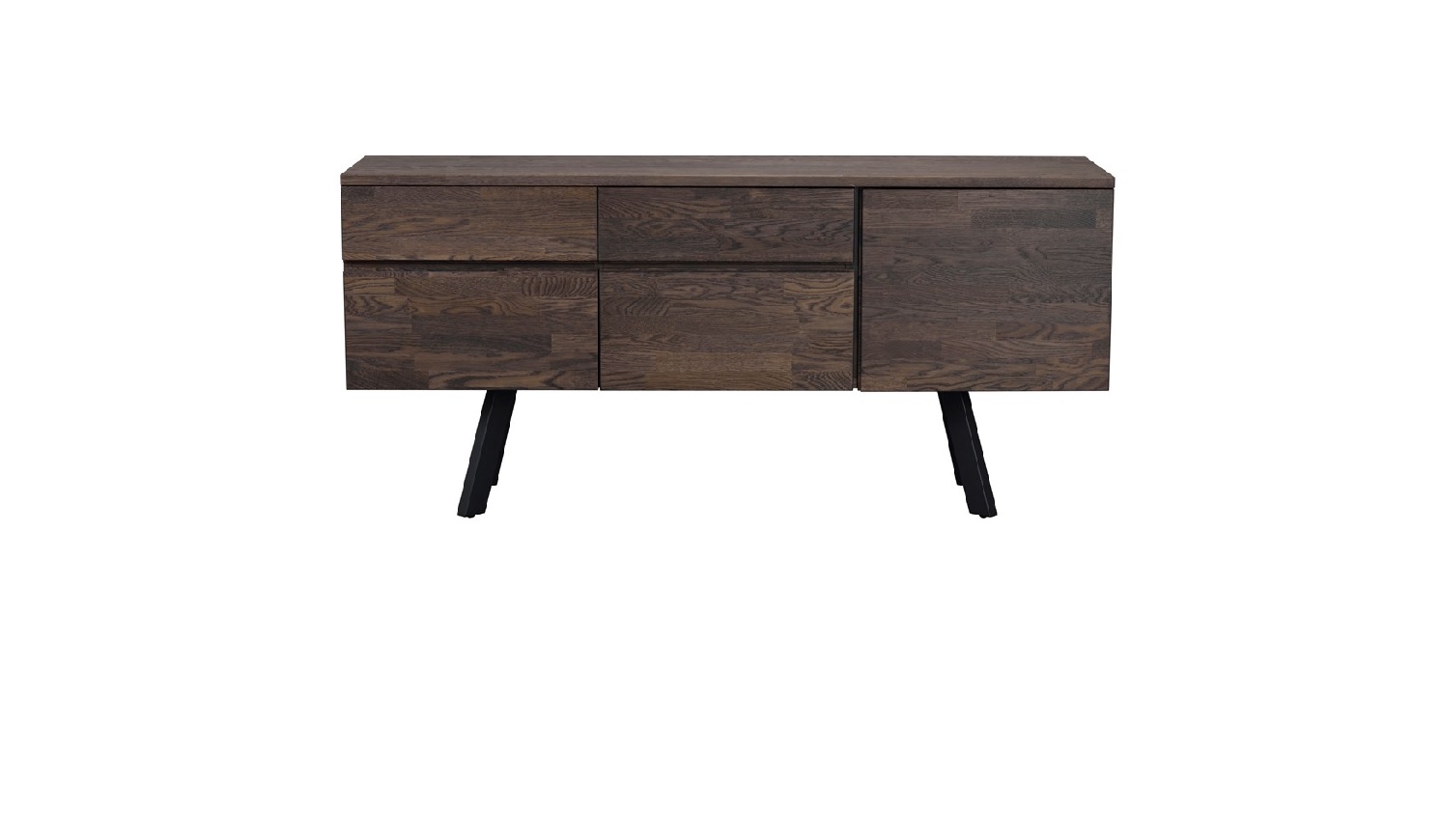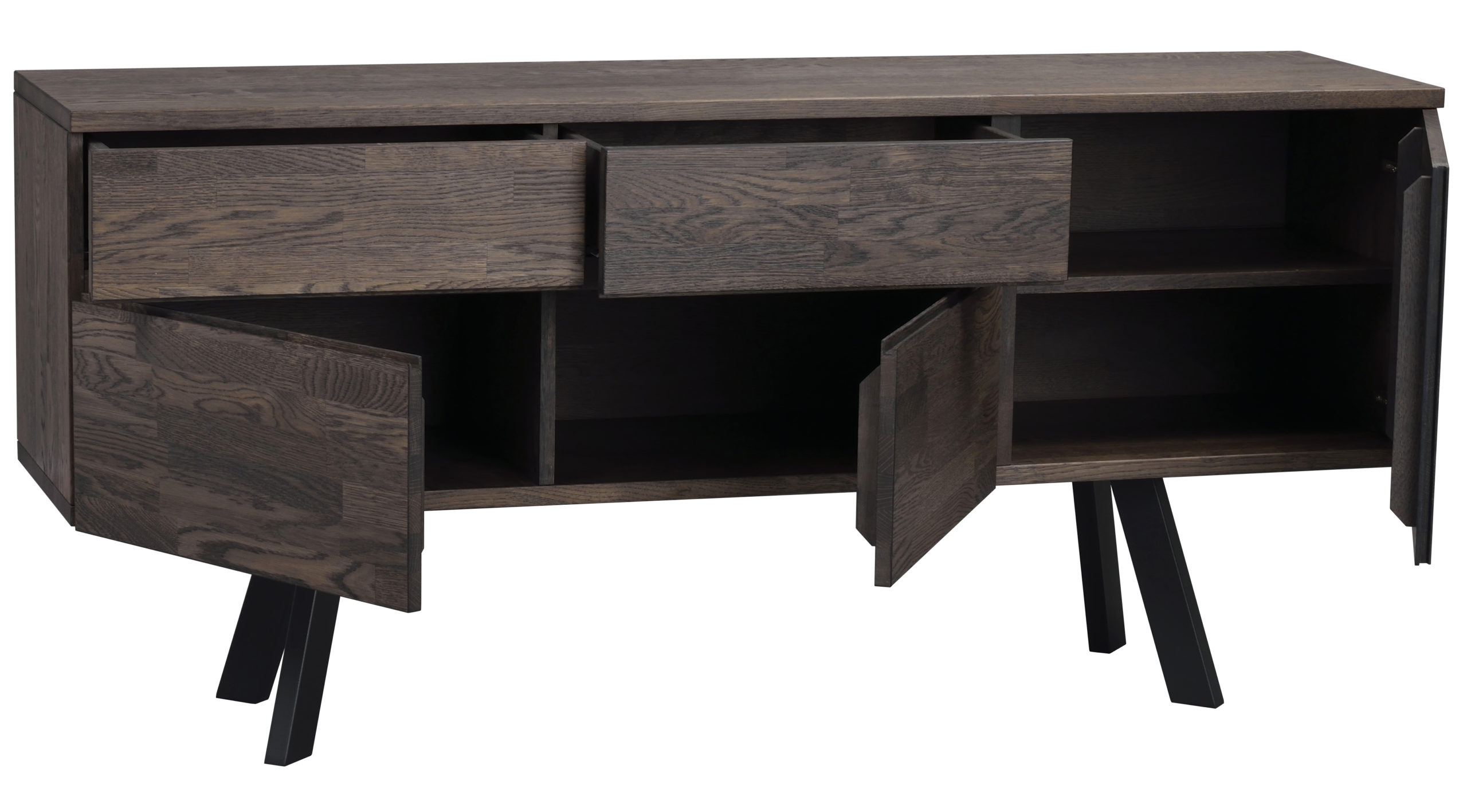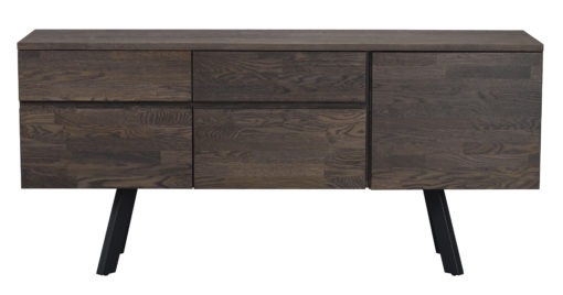 Avskalat sideboard i mörkbrun ek. Lätt utställda ben i pulverlackad svart metall. Gott om förvaringsutrymme med både lådor och luckor med flyttbara hyllor. Sideboardet ingår i vår serie Fred.
