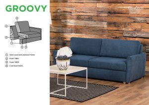 Groovy ram är gjord av massivt trä och plywood. Sittkuddar är fyllda med kallskum HR och ryggkuddar med skum.