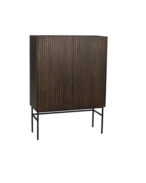 Trendiga Halifax skåp i brunlackad ek med svarta metallben i rak elegant profil. Ytan består av massiva ekribbor på faner och har två praktiska hyllplan, varav ett är justerbart. Knoppar i guldfärgad borstad metall medföljer och du väljer själv om du vill sätta dit dem eller ha utan. Dörrarna har mjukstängande soft-close funktion.