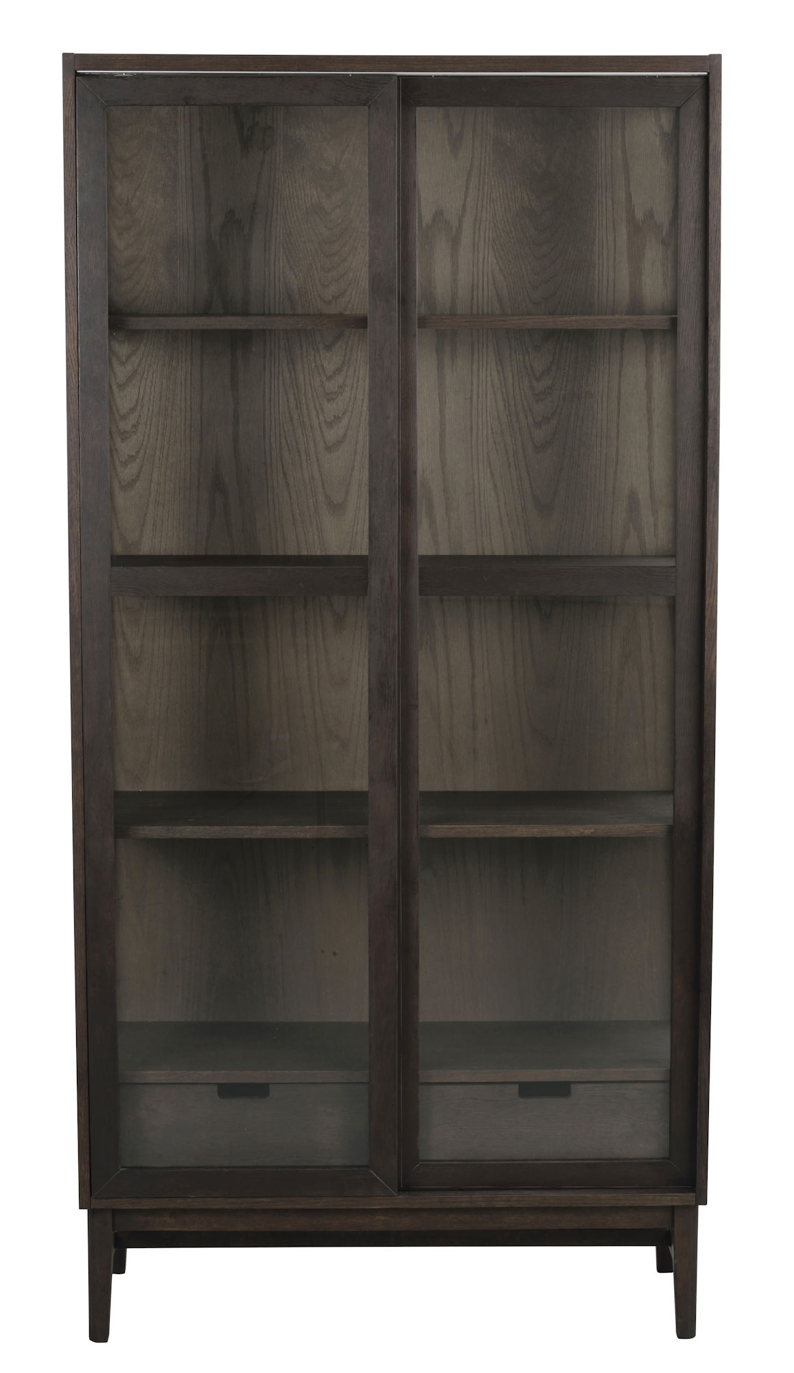 Hazelton vitrinskåp med stomme i brunoljad FSC®-certifierad ek och generöst ljusinsläpp från glaspartierna framifrån och på sidorna blir en imponerande möbel oavsett var i rummet den placeras. Det rymliga skåpet har praktiska skjutdörrar, tre fasta hyllplan samt två mjukstängande förvaringslådor längst ner för extra utrymme. Perfekt för att visa upp glas, böcker eller inredningsdetaljer men ändå kunna gömma undan vissa vardagsartiklar. Kombinera gärna med Hazelton sideboard i samma färg eller Plainfield matbord med matchande bordsben för en enhetlig stil.