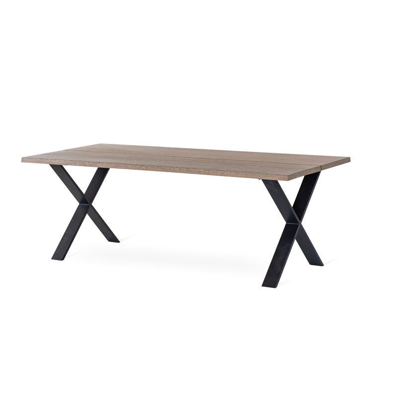 Hope matbord L 210 B 95 H 75 cm. Bordsskivan är tvådelad och i helmassiv gråbetsad smoked ek. Benen kan fås i tre olika utföranden, alla i pulverlackad svart metall. Benen kan placeras i två olika lägen på bordsskivansom ger mer eller mindre mellanrum mellan benen. Bordet kan förlängas med upp till två tilläggssivor.