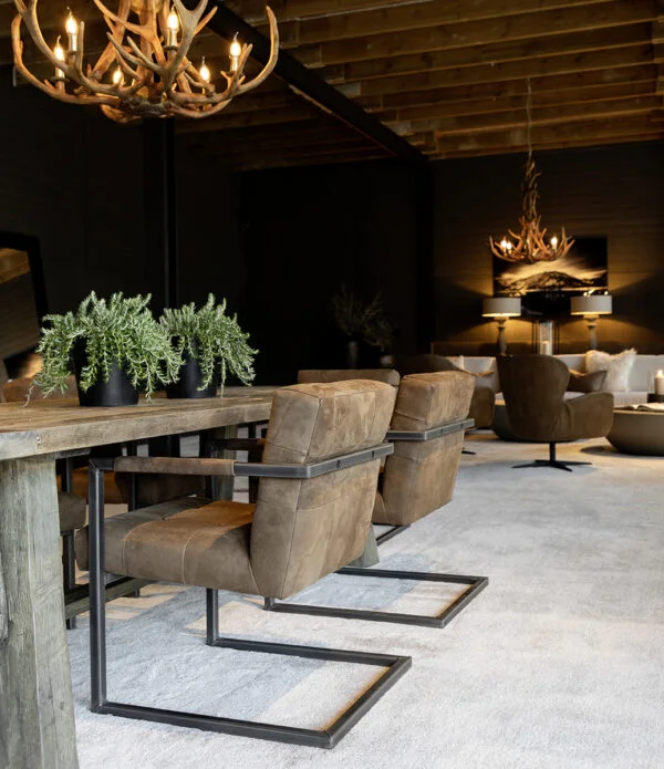 Nubuck brown leather. Natural iron. Stomme i plywood. Fyllning med skumfiber.