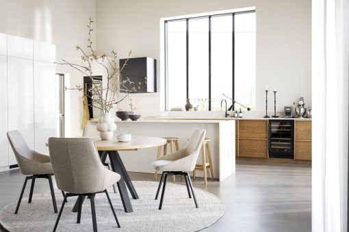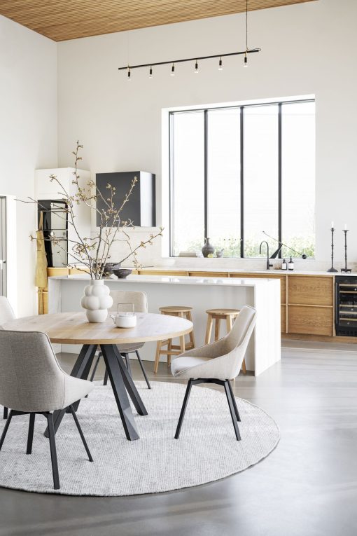 Maddock är ett praktiskt och förlängningsbart runt matbord med bordsskiva av FSC®-certifierad oljad ek och svarta pulverlackerade metallben. Matbordet blir blickfånget i rummet och förmedlar en stabil och stilsäker känsla. Skapa gemenskap och utrymme för fler genom att köpa till 1 eller 2 iläggsskivor och omvandla det till ett stort ovalt bord. Tack vare att trä med synliga kvistar har tagits tillvara i tillverkningen så har varje bord en unik träkänsla. Bordsskivan är semimassiv och det innebär att toppen består av 3 mm massiv ekfaner, vilket gör den mycket hållbar. Högkvalitativt och hållbart – detta är ett matbord att använda och älska i många år framöver. Finns även i brunoljad ek.