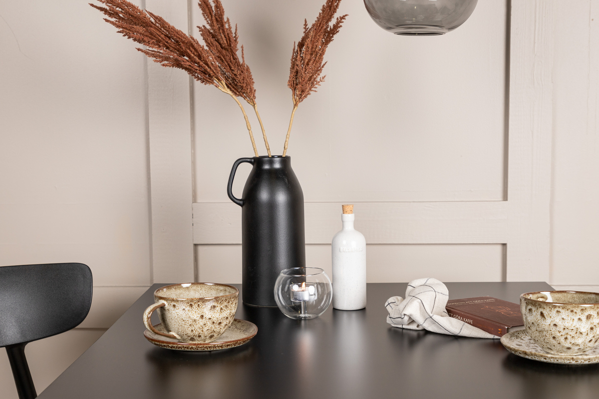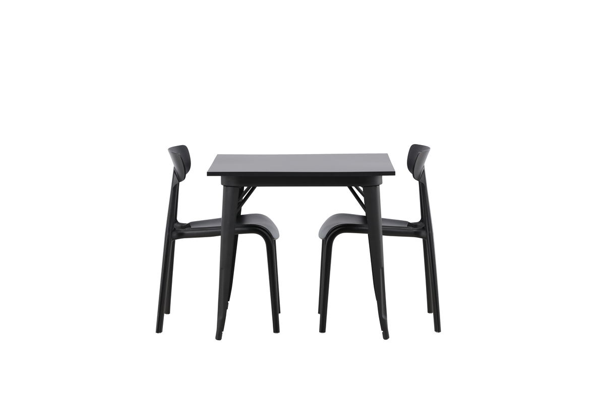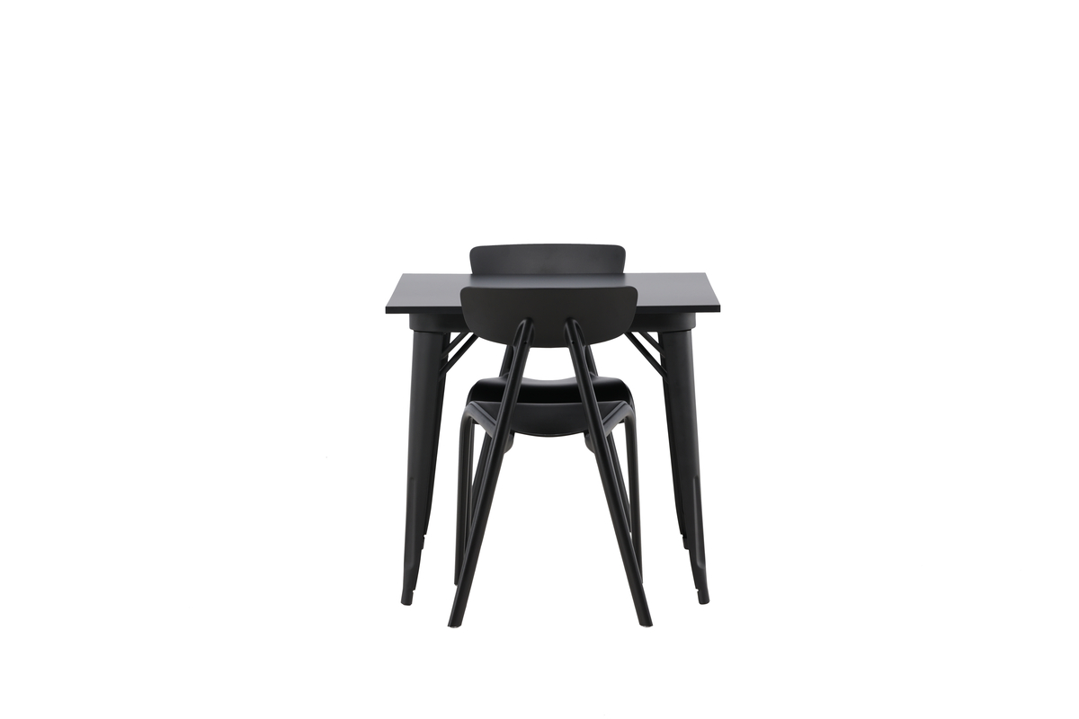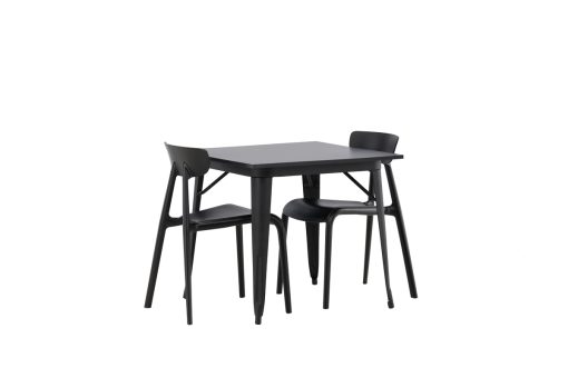 En perfekt matgrupp för det mindre köket! Matbordet Tempe har en skandinavisk design med raka nordiska former som står sig över tid. Tillverkad med en kvadratisk bordsskiva i svart MDF och bordsben i svart metall. Här tillsammans med 2st matstolar från serien Ursholmen. Tillverkade i slitstarkt plast i en sotig svart kulör som är enkel att matcha med övrig inredning. Stolen har en nätt stolsrygg, något djupare sittplats och lätt utsvängda ben i Skandinavisk design. Möblera smart och inbjudande med en trendig svart matgrupp!