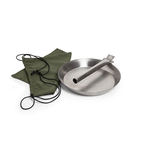 Med denna hopfällbara stekpanna kan du laga mat till hela familjen runt lägerelden. Panna är tillverkad i rostfritt och har ett ihåligt handtag i vilket du kan sticka in en pinne som förlängning om det börjar brännas om händerna. presentförpackning.