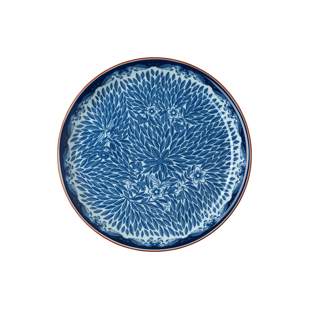 Denna Ostindia Floris-tallrik är klassiska Ostindias rebelliska kusin och har en modern form utan kant. Det djärva mönstret utmärks av ett tätt bladverk, som vecklar ut sig över tallriken. Använd denna eleganta tallrik för att lägga till en touch av vild frihet i dukningen. Ostindia Floris är ett fascinerande val för servering av smårätter.
