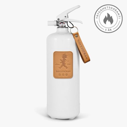 Brandsläckaren har ett läderemblem med präglad avbildning av Solstickepojken. Vitt väggfäste och instruktioner medföljer.