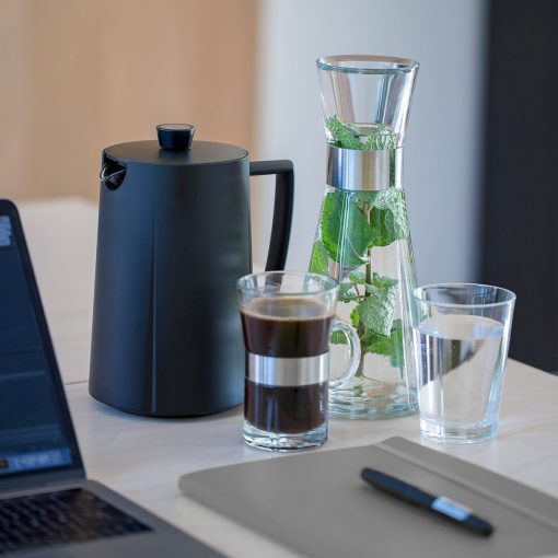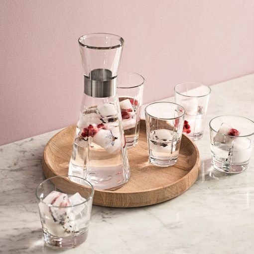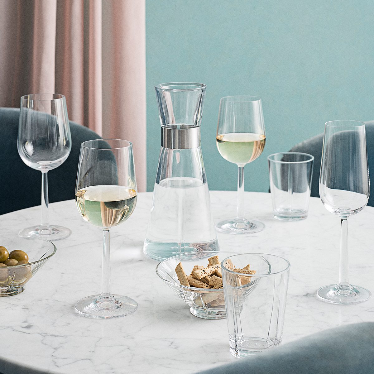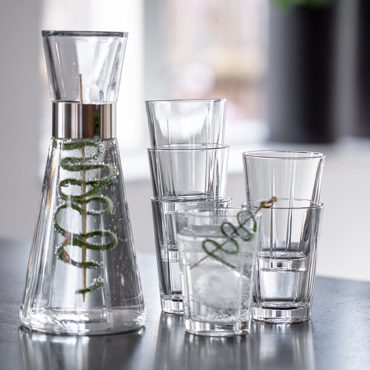 Den här karaffen har blivit populär över hela världen. Speciellt tack vare den enkla designen i glas med stålband. Servera iskallt, törstsläckande vatten och tillsätt myntablad, citron eller frysta bär för att piffa upp vattnet lite extra. Grand Cru-serien skapar en bra grund i köket genom hela livet och är lätt att kombinera med olika serviser och bestick