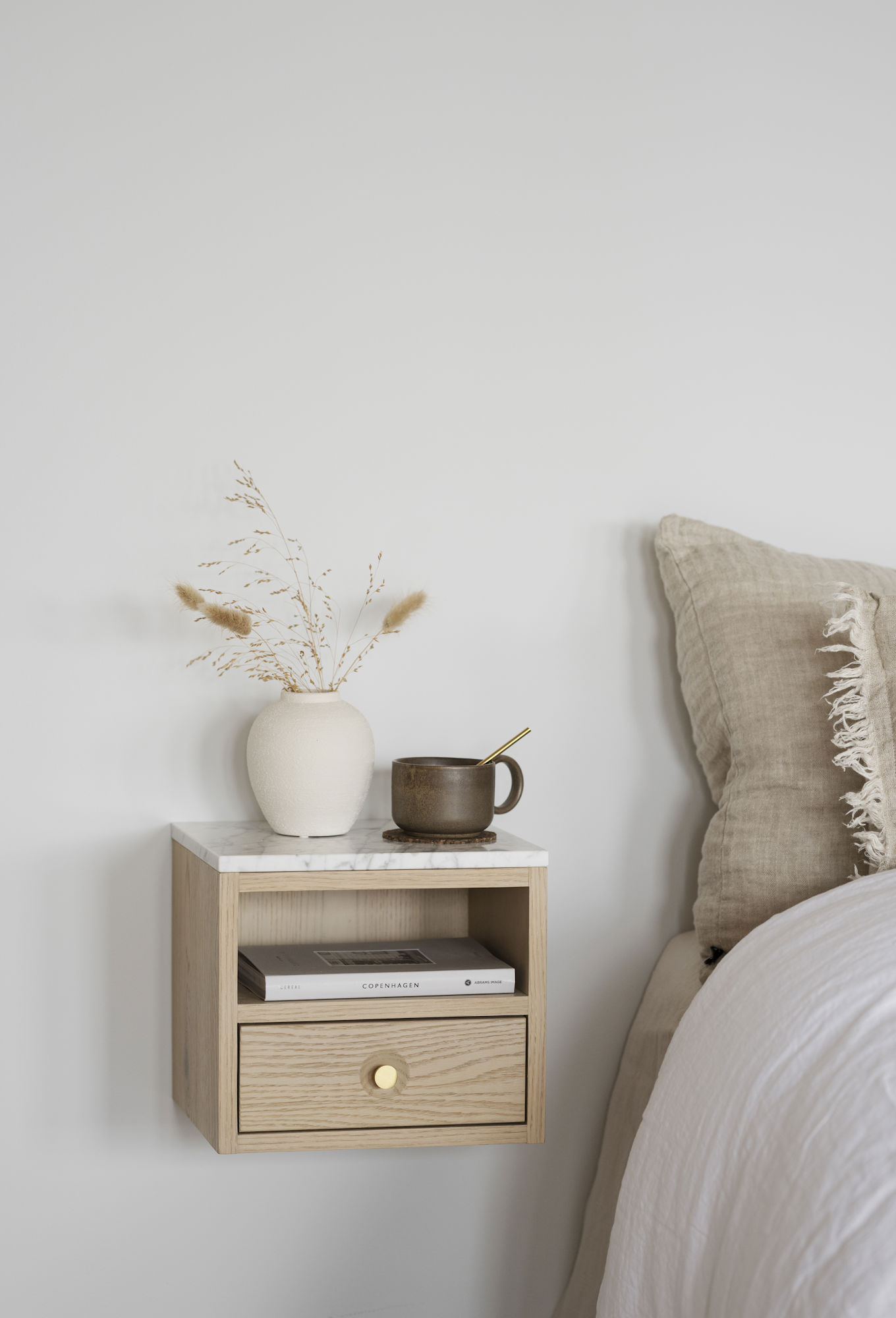 Whitmore sängbord i vitpigmenterad vildek har en elegant design med topp av vit marmor och lådor med vackra mässingsfärgade knoppar. Whitmore passar lika bra bredvid sängen i sovrummet som i hallen. Den väggmonterade designen skapar en svävande känsla och gör det dessutom enkelt att städa och hålla ordning i rummet. Finns även i lackad ek.